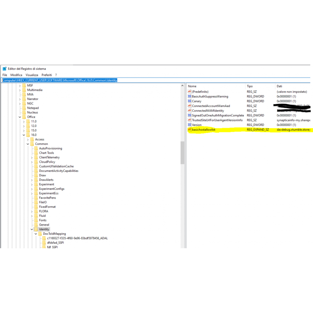 All you need is to declare a new registry key “basichostallowlist” a position: Computer\HKEY_CURRENT_USER\SOFTWARE\Microsoft\Office\16.0\Common\Identity