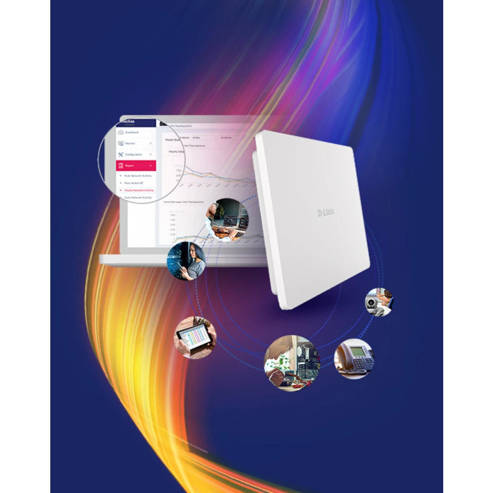 D-Link AX3000 Wi-Fi 6 Outdoor Nuclias Connect PoE Access Point D-Link AX3000 Wi-Fi 6 Dual-Band PoE Outdoor Access Point. 2.4 GHz, 5 GHz, Maximum data transfer rate: 3000 Mbit/s. Security algorithms: 64-bit WEP, 128-bit WEP, SSID, WEP, WPA, WPA2, WPA3. Ethernet LAN data rates: 10,100,1000,2500 Mbit/s. Power over Ethernet (PoE). Product colour: White. Power consumption (max): 16.7 W Nuclias Connect AX3000