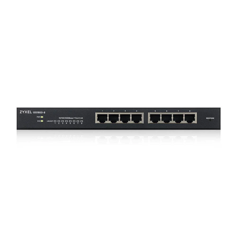 Zyxel GS1900-8. Switch type: Managed, Switch layer: L2. Basic switching RJ-45 Ethernet ports type: Gigabit Ethernet (10/100/1000), Basic switching RJ-45 Ethernet ports quantity: 8. Full duplex. MAC address table: 8000 entries, Switching capacity: 16 Gbit/s. Networking standards: IEEE 802.1Q, IEEE 802.1p, IEEE 802.1x, IEEE 802.3, IEEE 802.3ab, IEEE 802.3ad, IEEE 802.3af, IEEE.... Power connector: DC-in jack. Rack mounting