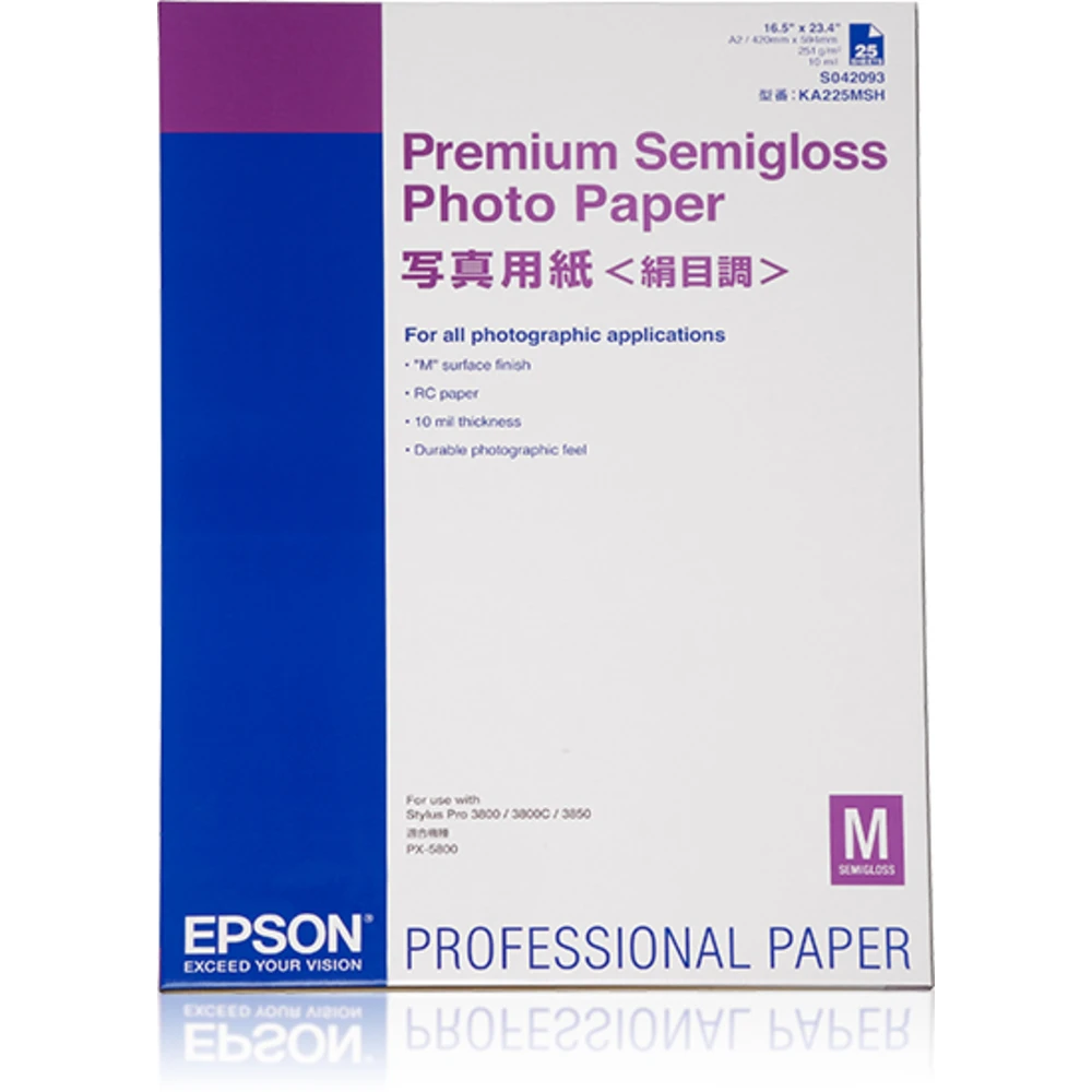 Epson Premium Semigloss Photo Paper, DIN A2, 250g/m², 25 Sheets. Finish type: Semi-gloss, Media weight: 250 g/m², Paper size: A2. Width: 420 mm, Height: 594 mm. Quantity per pack: 1 pc(s), Package width: 435 mm, Package depth: 610 mm. Pallet width (UK): 100 cm, Pallet length (UK): 120 cm, Pallet height (UK): 74 cm. Country of origin: Japan