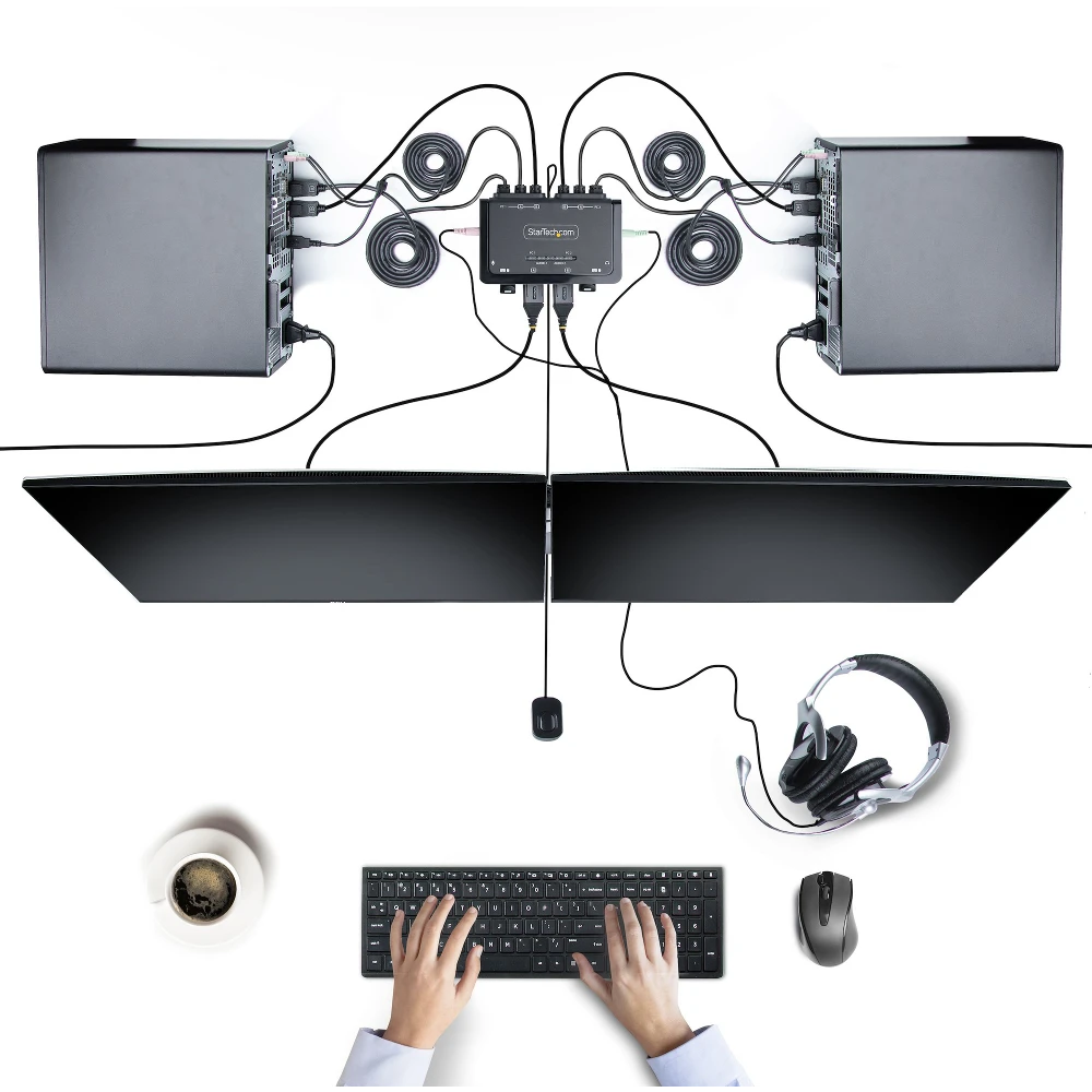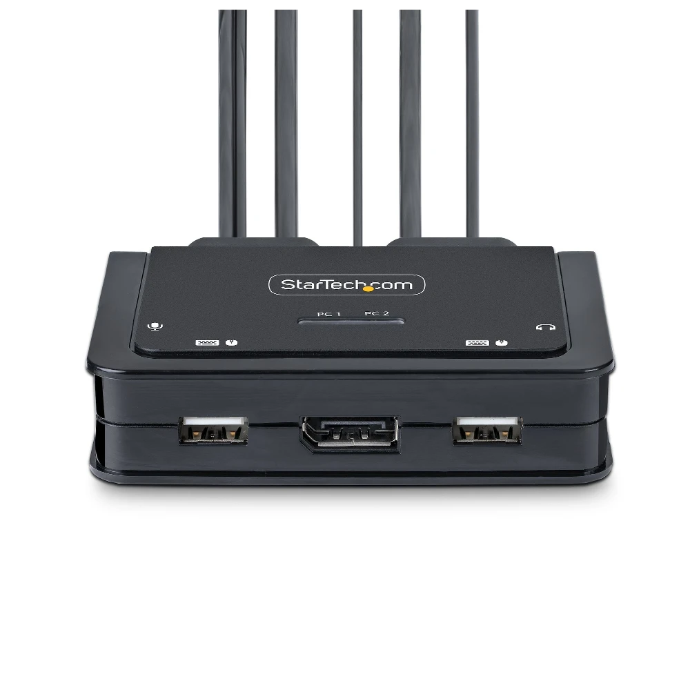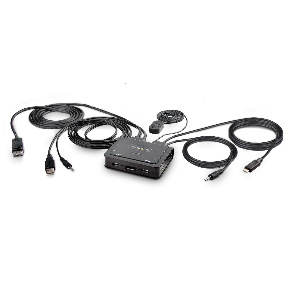 Share a mouse, keyboard, and a 4K 60Hz DisplayPort display between a USB-A computer and a USB-C DP Alt-mode computer, using this KVM Switch with built-in cablesThis Hybrid KVM Switch enables users to switch between a USB Type-A and DisplayPort-enabled desktop and a USB Type-C (DP Alt-Mode) enabled laptop, to share a keyboard, mouse, audio input/output devices, and a single 4K 60Hz DisplayPort monitor.Hassle-Free SetupThe KVM switch is bus powered and features built-in DisplayPort, USB-A, USB-C, and 3.5mm Audio Input/Output cables. This ensures compatibility and performance between the KVM switch, monitors, and peripherals - without the need to select and purchase the cables required for those connections.CompatibilityThe 2-port KVM switch is compatible with all operating systems, including Windows, macOS, ChromeOS, and Linux. The KVM works with all hardware platforms including Intel, AMD, and Apple M1/M2. The USB-C host port works with USB-C, USB4, Thunderbolt 3, and Thunderbolt 4 laptops. If the desktop does not have a 4-position 3.5mm port the included 3.5mm Headset Adapter ensures compatibility out of the box.Intuitive ControlThe KVM switch offers two options to switch between hosts - a remote push button or hotkey commands, using the downloadable software. The remote push button includes a 1.5m cable for optimal placement in the setup. Independent audio switching can be achieved through the software, utilizing keyboard shortcuts (i.e., hotkeys), ensuring uninterrupted audio when switching between host devices.Enhance Productivity and Device Management with the StarTech.com Connectivity Tools ApplicationDeveloped to improve performance and security, StarTech.com Connectivity Tools is the only software suite on the market that works with a wide range of IT connectivity accessories. The software suite includes:? Advanced Windows Layout Utility: Setup and save custom windows layouts.? MAC Address Pass-Through Utility: Improve network security.? USB Event Monitoring Utility: Track and log connected USB devices.? Wi-Fi Auto Switch Utility: Enable users to quickly access faster network speeds via wired LAN.For more information and to download the StarTech.com Connectivity Tools application, please visit: www.startech.com/connectivity-toolsThe StarTech.com Advantage