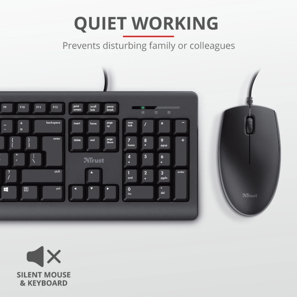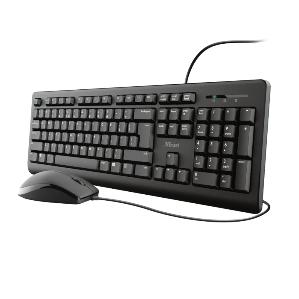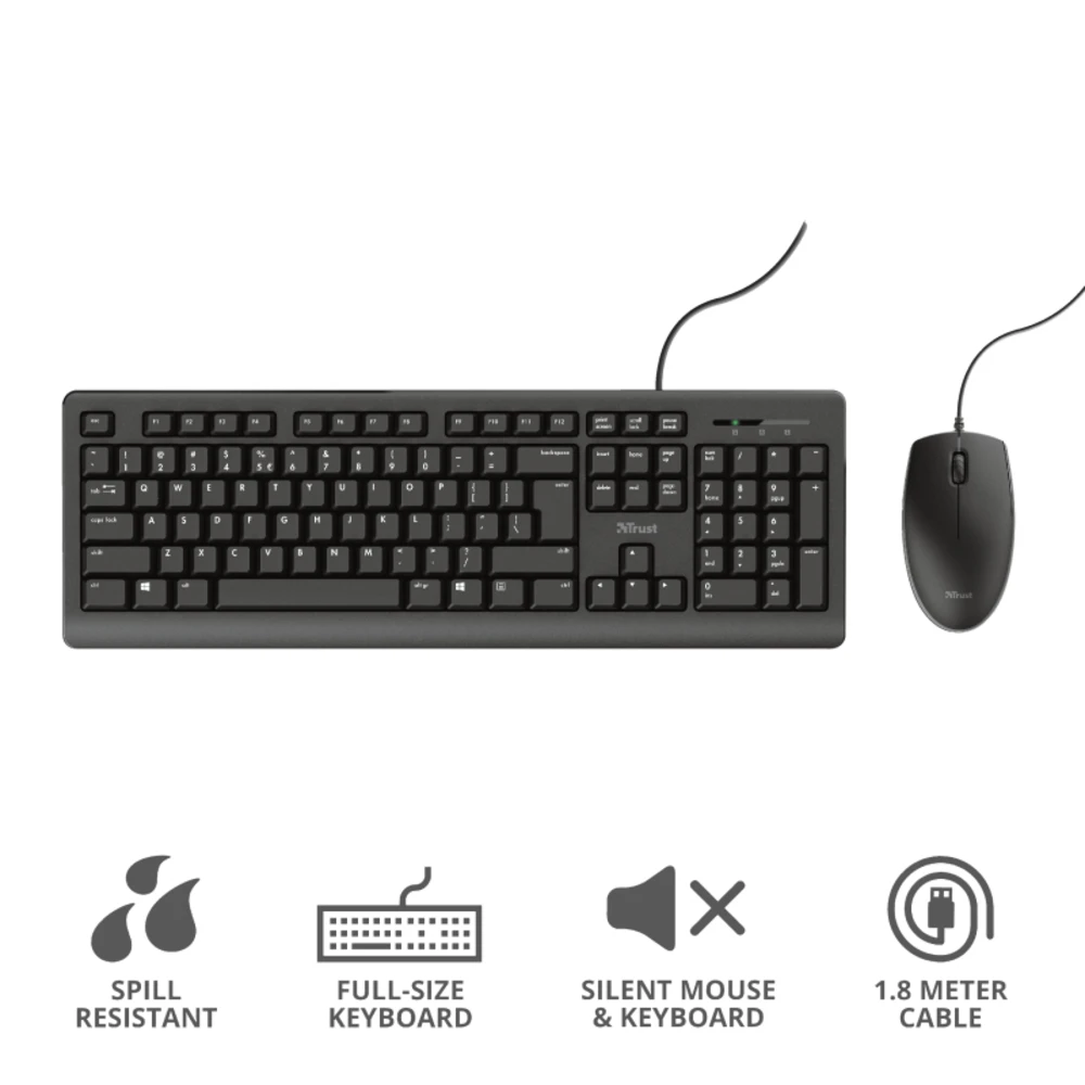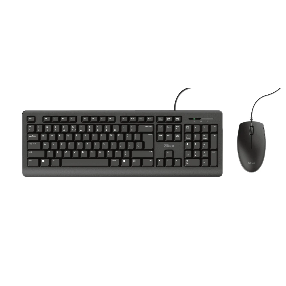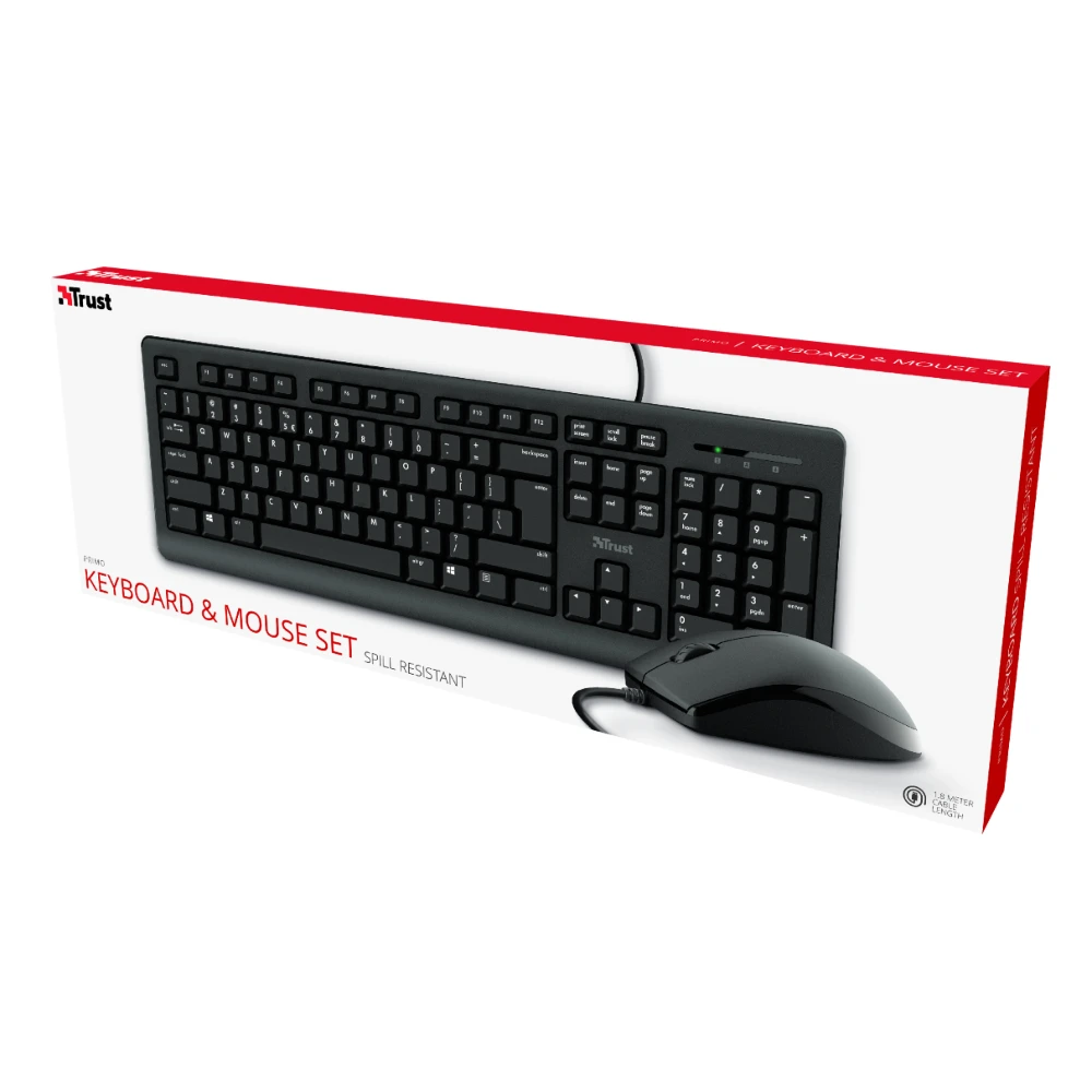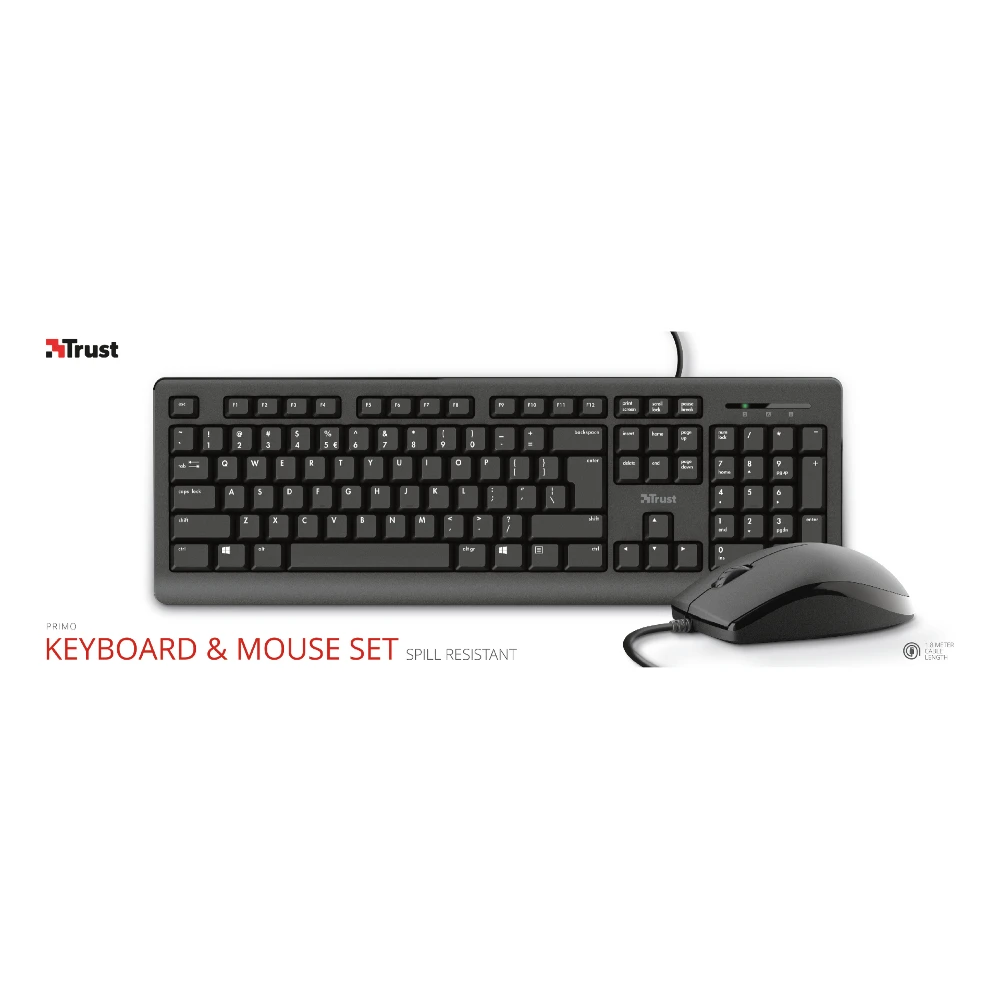 Wired keyboard, USB, QWERTY (IT) + Wired mouse, 1.8m, 548 g Trust Primo Keyboard & Mouse Set. Keyboard form factor: Full-size (100%). Keyboard style: Straight. Device interface: USB, Keyboard key switch: Membrane, Keyboard layout: QWERTY. Cable length: 1.8 m. Recommended usage: Office. Product colour: Black. Mouse included Cover the Basics