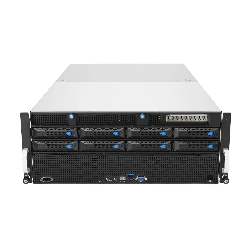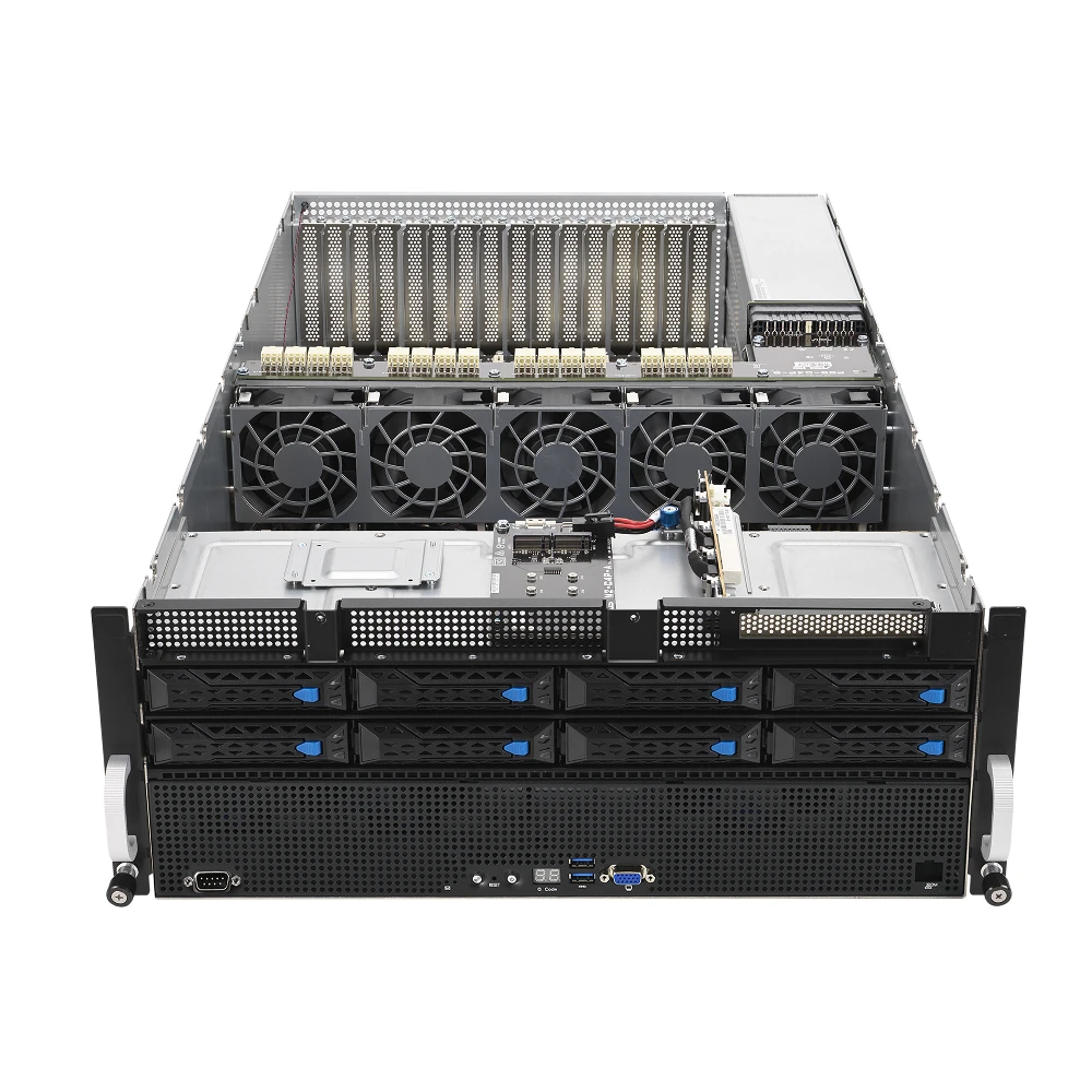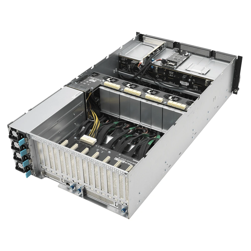 AMD EPYC? 7003 4U dual-socket GPU server featuring eight dual-slot GPUs, dual NVMe, dual M.2, OCP 3.0, four 3000 W Titanium power supplies and ASUS ASMB10-iKVM ASUS ESC8000A-E11. Processor socket: Socket SP3, Compatible processor series: AMD EPYC 7003. Supported memory types: DDR4-SDRAM, Supported DIMM module capacities: 16GB, 32GB, 64GB, 128GB, Maximum internal memory: 8.19 TB. SSD form factor: M.2. Chassis type: Rack (4U), Product colour: Silver. Power supply: 3000 W, AC input voltage: 220 - 240 V, AC input frequency: 50 - 60 Hz