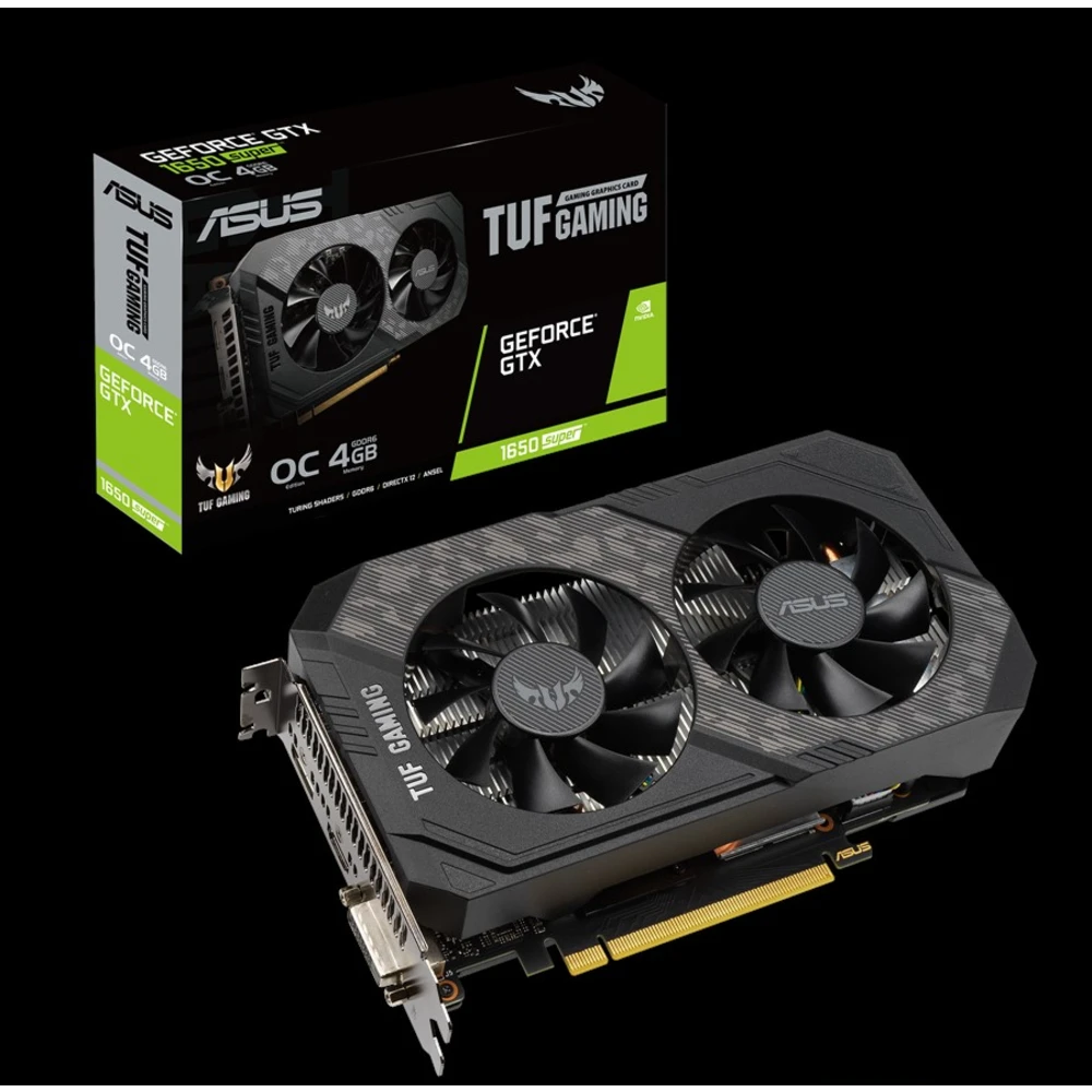 TUF Gaming GeForce GTX 1650 SUPER OC Edition, PCI Express 3.0, 4GB GDDR6, 12002 MHz, DVI-D, HDMI 2.0b, DP 1.4, HDCP 2.2, 6-pin, 206x124x46 mm ASUS TUF-GTX1650S-O4G-GAMING. Graphics processor family: NVIDIA, Graphics processor: GeForce GTX 1650 SUPER, Processor frequency: 1530 MHz. Discrete graphics card memory: 4 GB, Graphics card memory type: GDDR6, Memory bus: 128 bit, Memory clock speed: 12002 MHz. Maximum resolution: 7680 x 4320 pixels. DirectX version: 12.0, OpenGL version: 4.6. Interface type: PCI Express x16 3.0. Cooling type: Active, Number of fans: 2 fan(s)