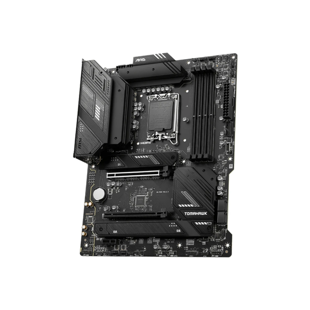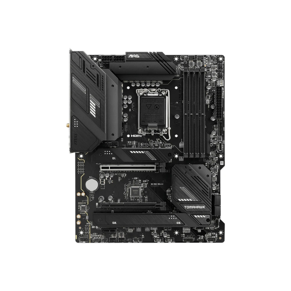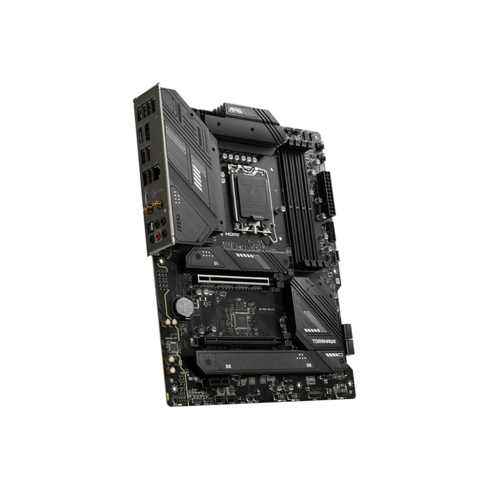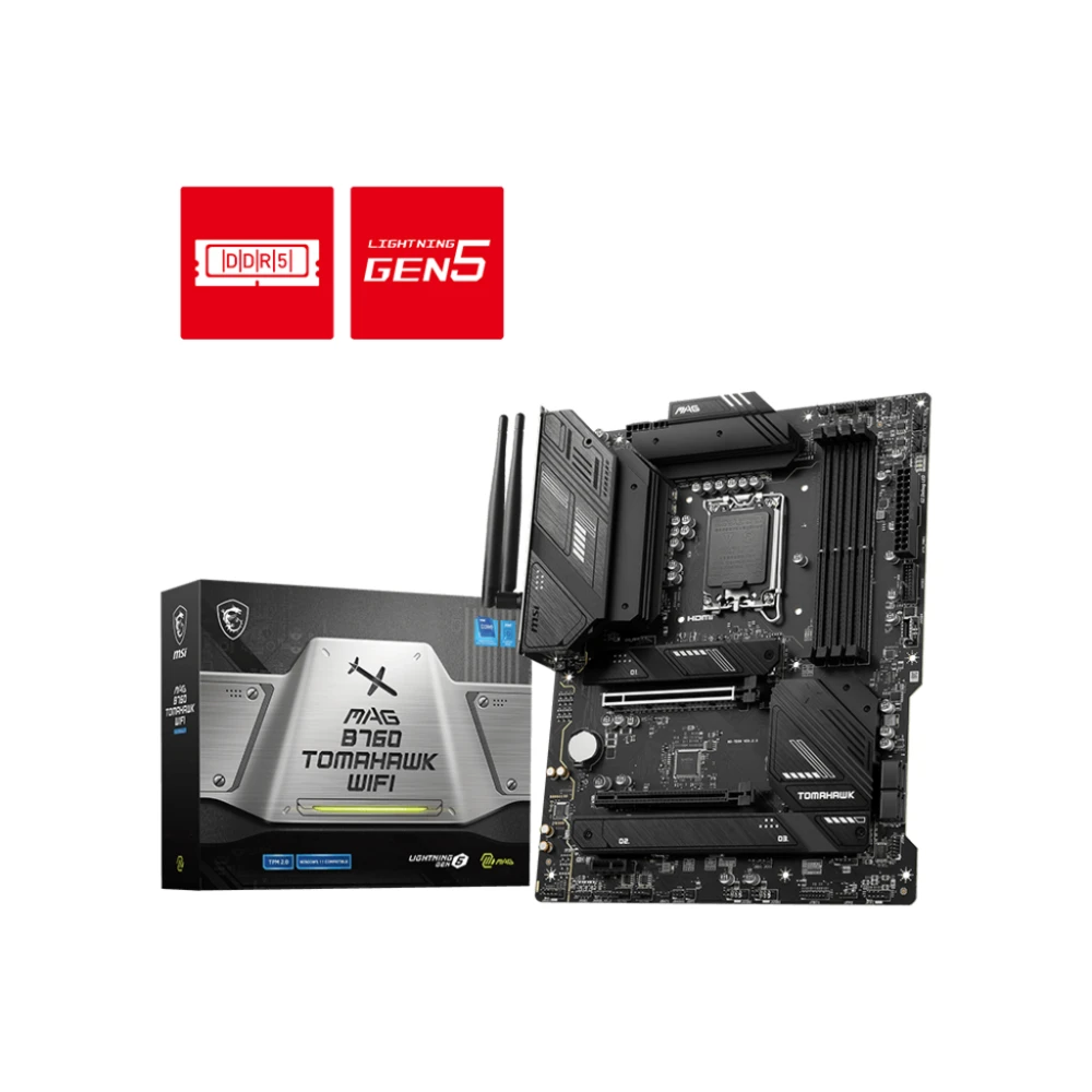 LGA 1700, Intel B760, 4x DDR5, 7000 MHz, 1x HDMI, 1x DisplayPort, 4x SATA 6G, ATX MSI MAG B760 TOMAHAWK WIFI. Processor manufacturer: Intel, Processor socket: LGA 1700, Compatible processor series: Intel? Celeron?, Intel? Pentium? Gold. Supported memory types: DDR5-SDRAM, Maximum internal memory: 128 GB, Memory slots type: DIMM. Supported storage drive interfaces: M.2, SATA III, RAID levels: 0, 1, 5, 10. Ethernet interface type: 2.5 Gigabit Ethernet, Top Wi-Fi standard: Wi-Fi 6E (802.11ax), Wi-Fi standards: 802.11a, 802.11b, 802.11g, Wi-Fi 4 (802.11n), Wi-Fi 5 (802.11ac), Wi-Fi 6 (802.11ax), Wi-Fi 6E.... Component for: PC, Motherboard form factor: ATX, Motherboard chipset family: Intel unite as one