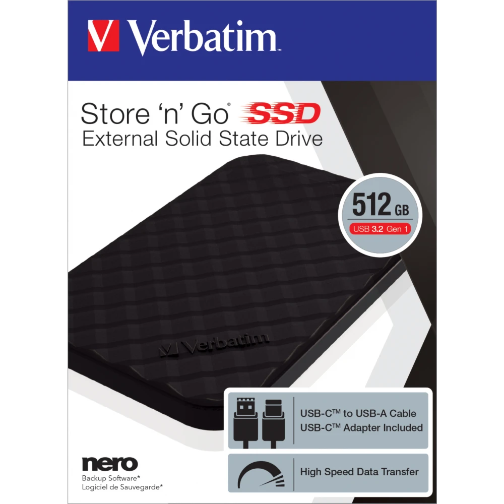 Store 'n' Go, 512 GB, USB 3.2 Gen 1 Type C, Black Verbatim Store 'n' Go Portable SSD USB 3.2 GEN 1 512GB. SSD capacity: 512 GB. USB connector: USB Type-C, USB version: 3.2 Gen 1 (3.1 Gen 1). Product colour: Black Ideal for users on the move, the Store 'n' Go Portable SSD provides a fast and safe solution for expanding your storage and backing up your files. The USB 3.2 Gen 1 interface features data transfer speeds up to 5Gbps** so you can move those large files and do the high capacity photo editing when you need to.