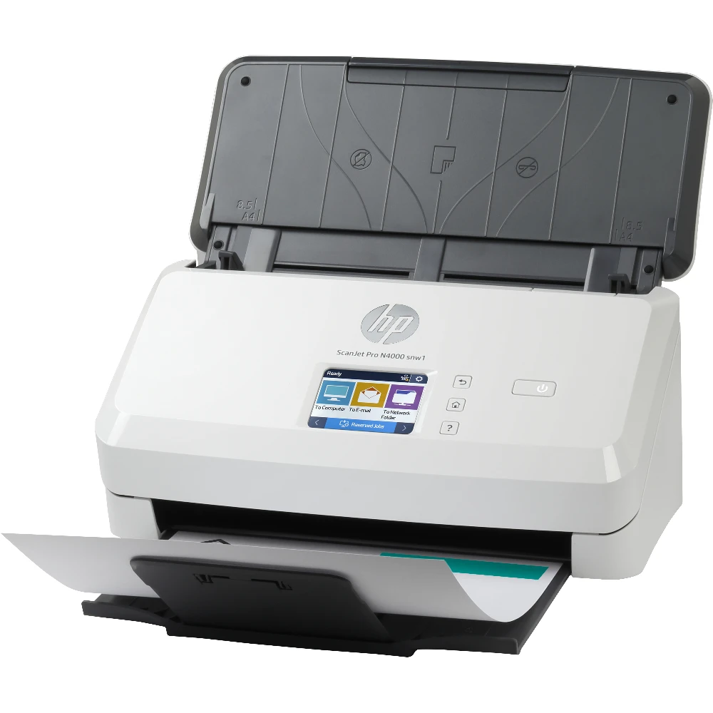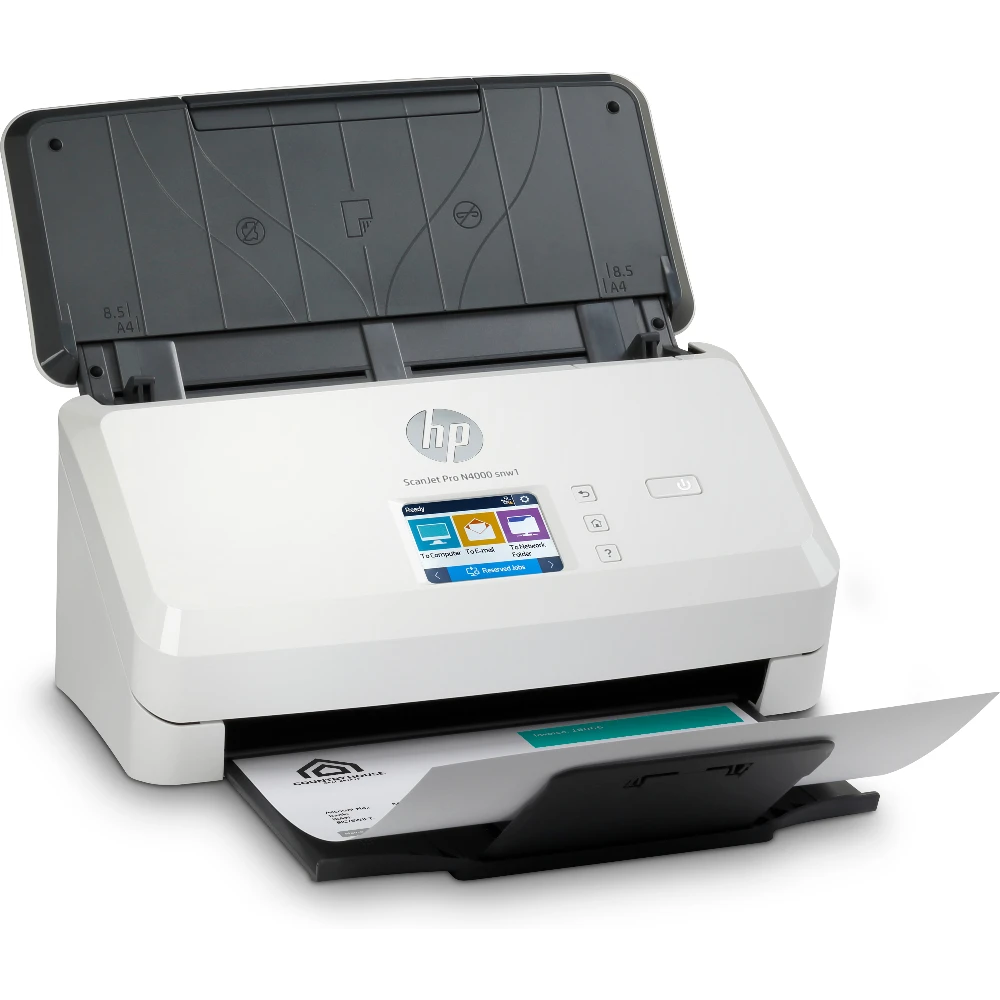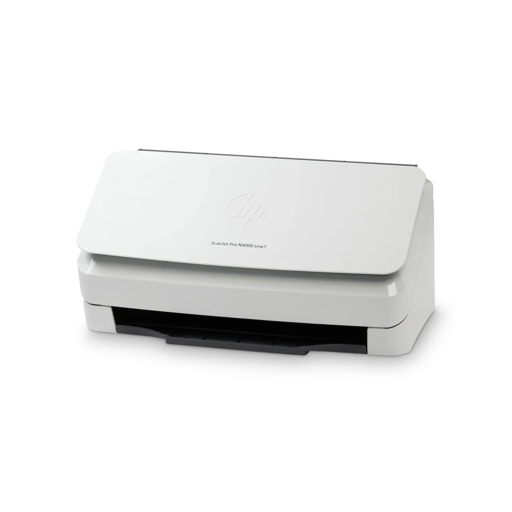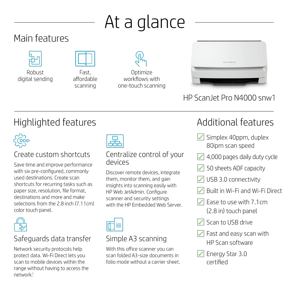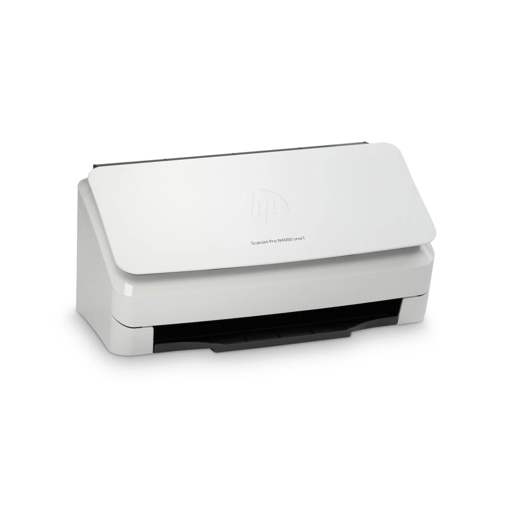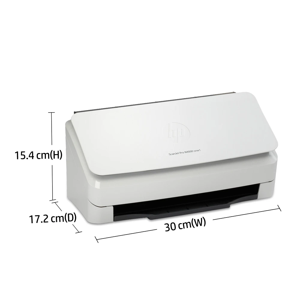 HP Scanjet Pro N4000 snw1 Sheet-feed Scanner. Maximum scan size: 216 x 3100 mm, Optical scanning resolution: 600 x 600 DPI. Scanner type: Sheet-fed scanner, Product colour: Black, White. Sensor type: CMOS CIS, Daily duty cycle (max): 4000 pages, Scanning noise level: 59 dB. Auto document feeder (ADF) input capacity: 50 sheets. Maximum ISO A-series paper size: A4, Scanning media types supported: Business Card, Plastic Card, Auto Document Feeder (ADF) media weight: 40 - 210 g/m²