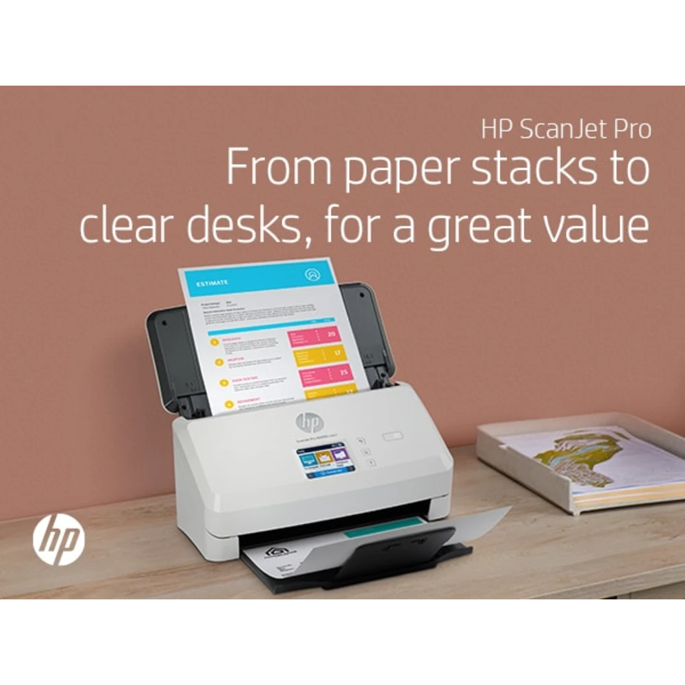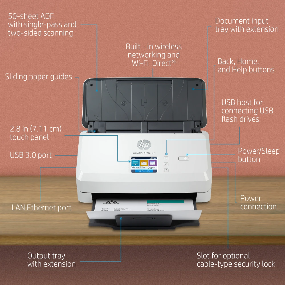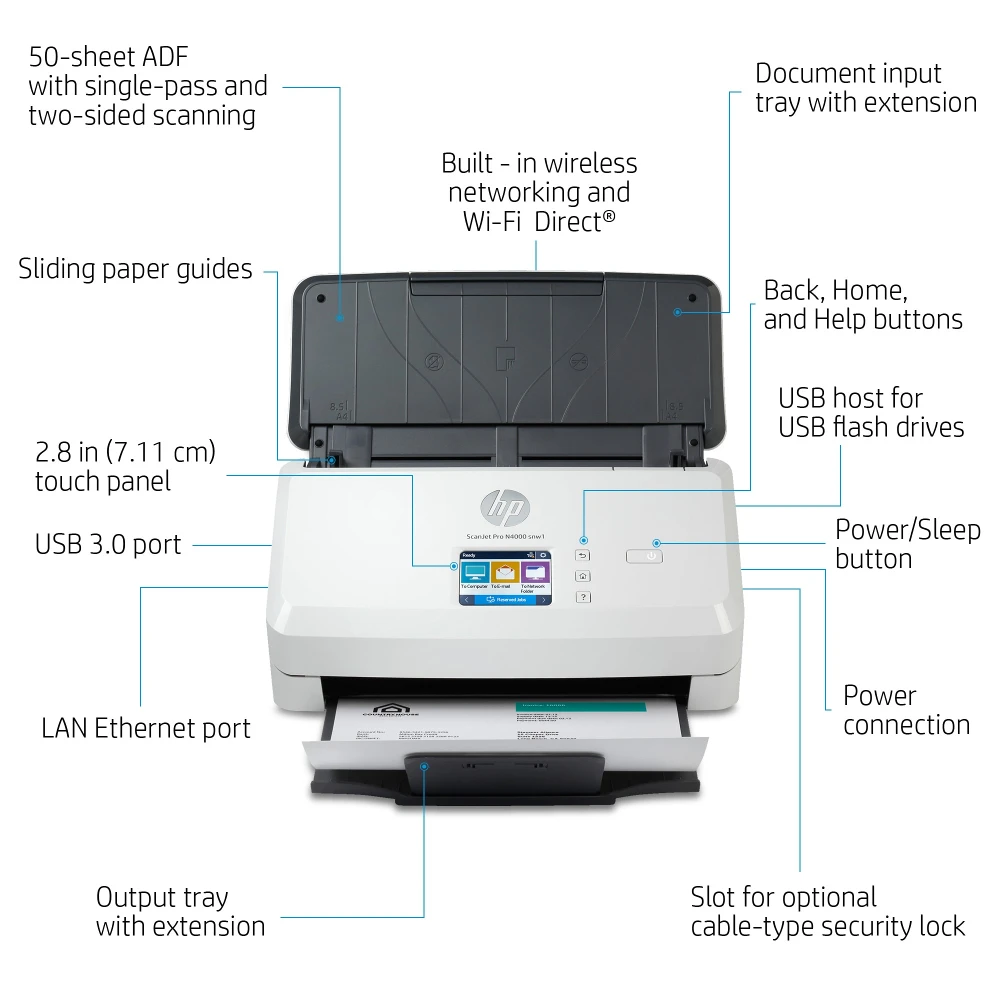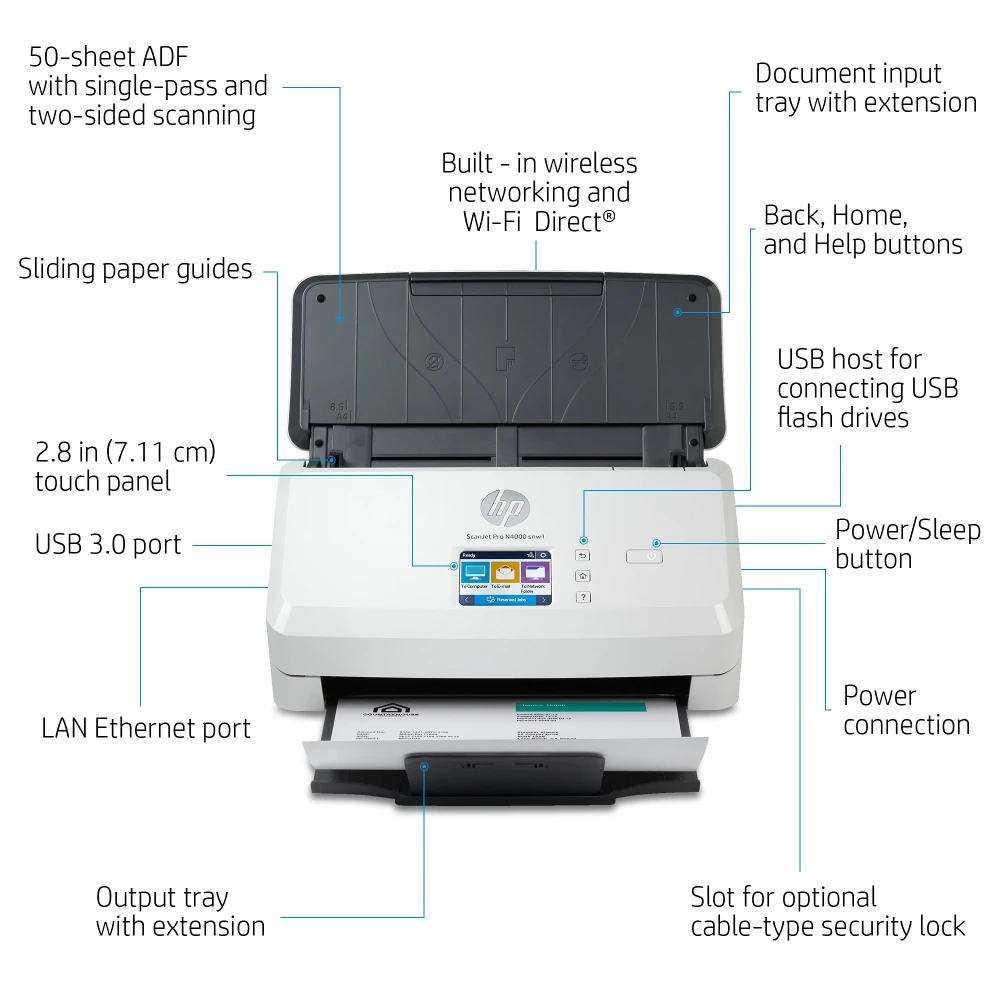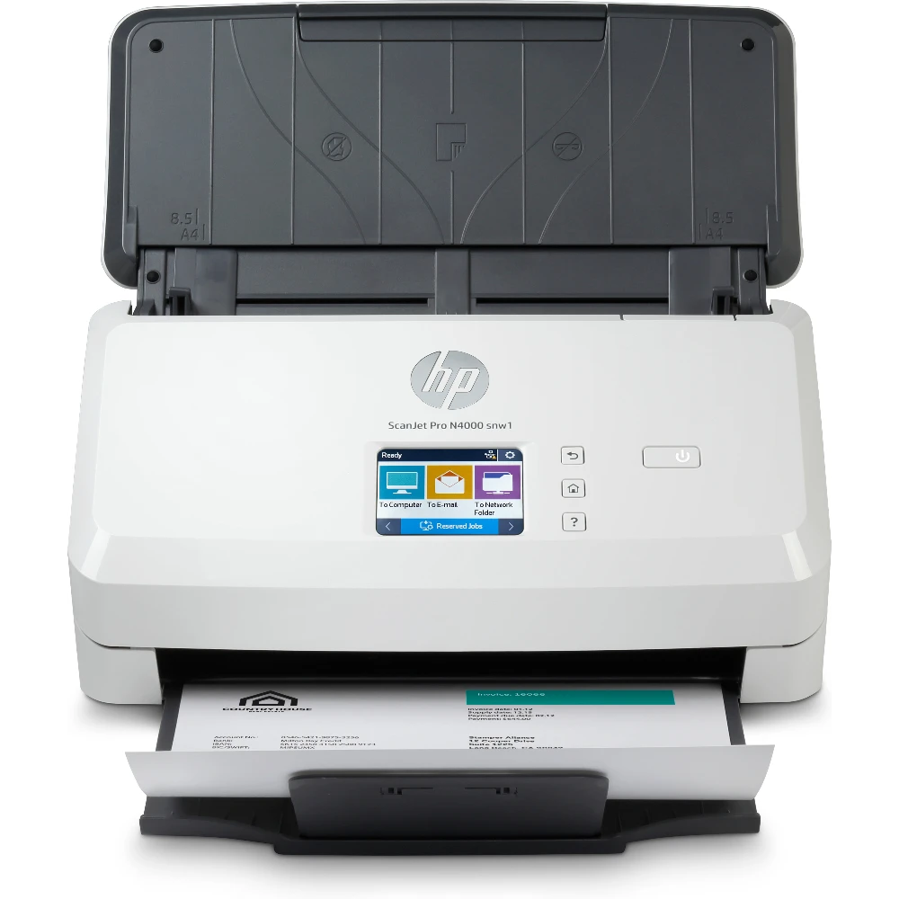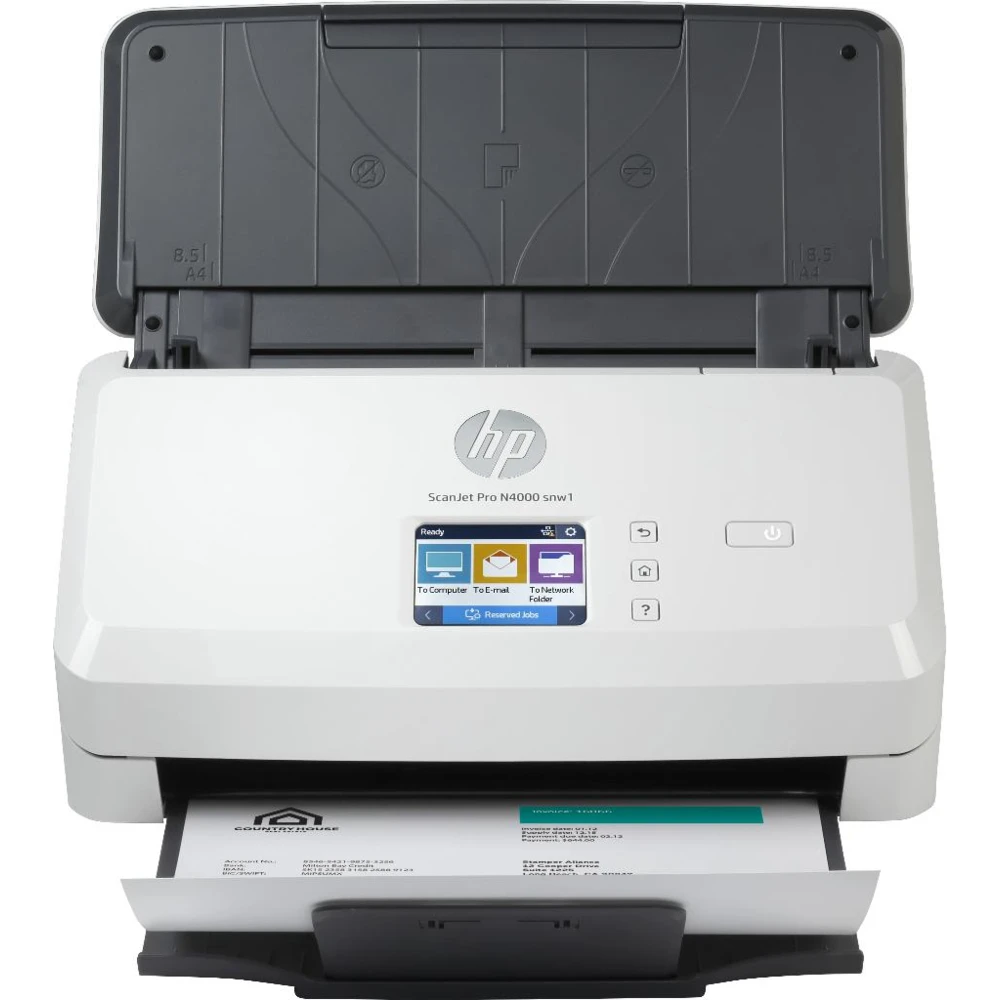 HP Scanjet Pro N4000 snw1 Sheet-feed Scanner. Maximum scan size: 216 x 3100 mm, Optical scanning resolution: 600 x 600 DPI. Scanner type: Sheet-fed scanner, Product colour: Black, White. Sensor type: CMOS CIS, Daily duty cycle (max): 4000 pages, Scanning noise level: 59 dB. Auto document feeder (ADF) input capacity: 50 sheets. Maximum ISO A-series paper size: A4, Scanning media types supported: Business Card, Plastic Card, Auto Document Feeder (ADF) media weight: 40 - 210 g/m²