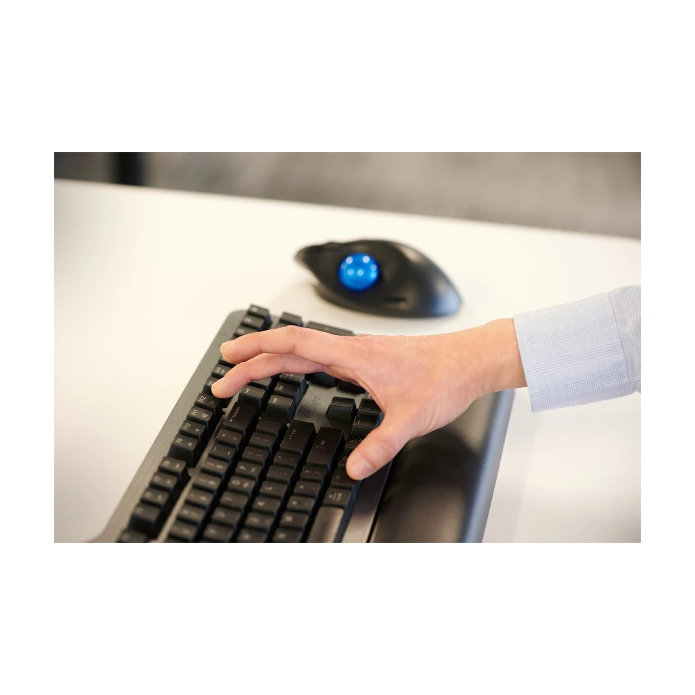 The Pro Fit? Ergo TB450 Trackball combines the feel of a wireless mouse with the precision of a trackball. It uses an ergonomic design with a 45? tilt that helps improve wrist and forearm alignment, takes up less desk space than a conventional mouse, and is more comfortable during extended use. Users can choose Bluetooth? Low Energy (LE) and 2.4GHz wireless connection options for maximum flexibility. To help reduce global environmental impacts, the TB450 is made of 50% recycled plastic. It also features long battery life, patented ball ejection system for easy cleaning, and precision optical-tracking technology.