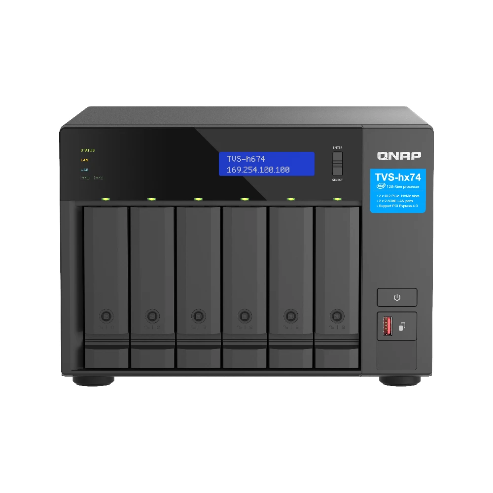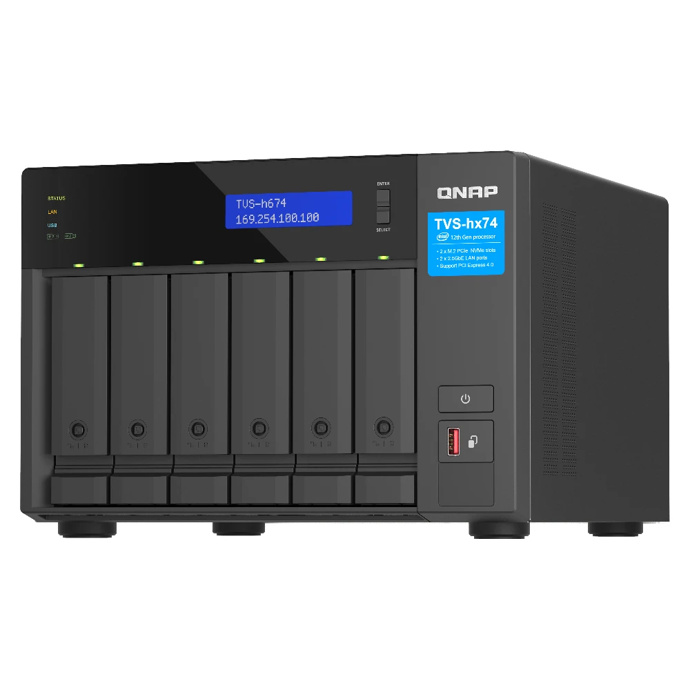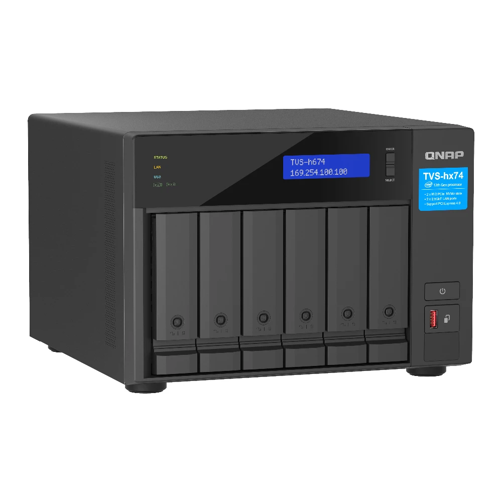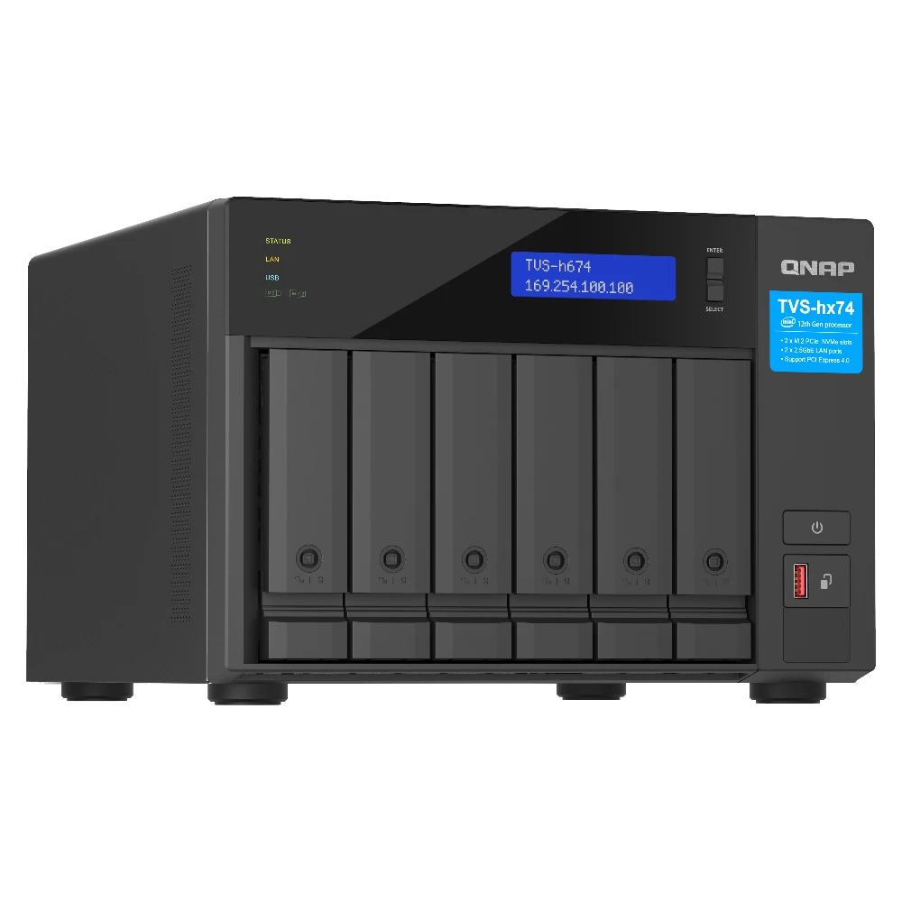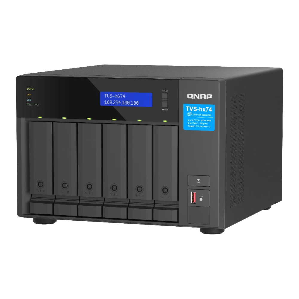 QNAP TVS-H674T-I5-32G. Type: NAS. Chassis type: Tower. Device class: Small & Medium Business. Processor family: Intel® Core™ i5, Processor model: i5-12400, Processor frequency: 2.5 GHz. Internal memory: 32 GB, Internal memory type: DDR4. Installed storage drive type: HDD. Operating system installed: QNAP QTS