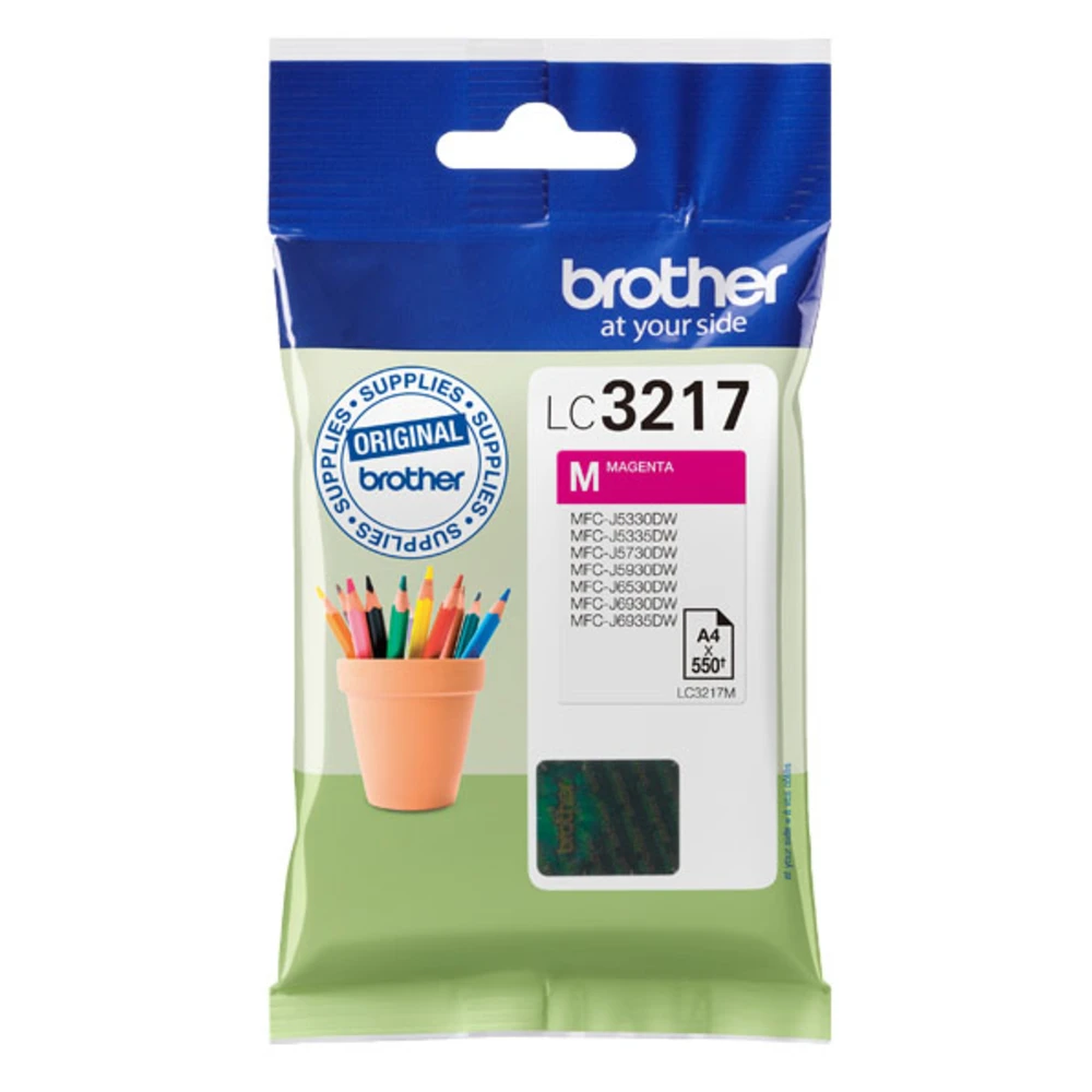 Brother LC-3217M. Colour ink type: Pigment-based ink, Supply type: Single pack, Colour ink page yield: 550 pages, Colour ink volume: 550 ml, Printing colours: Magenta, Quantity per pack: 1 pc(s)