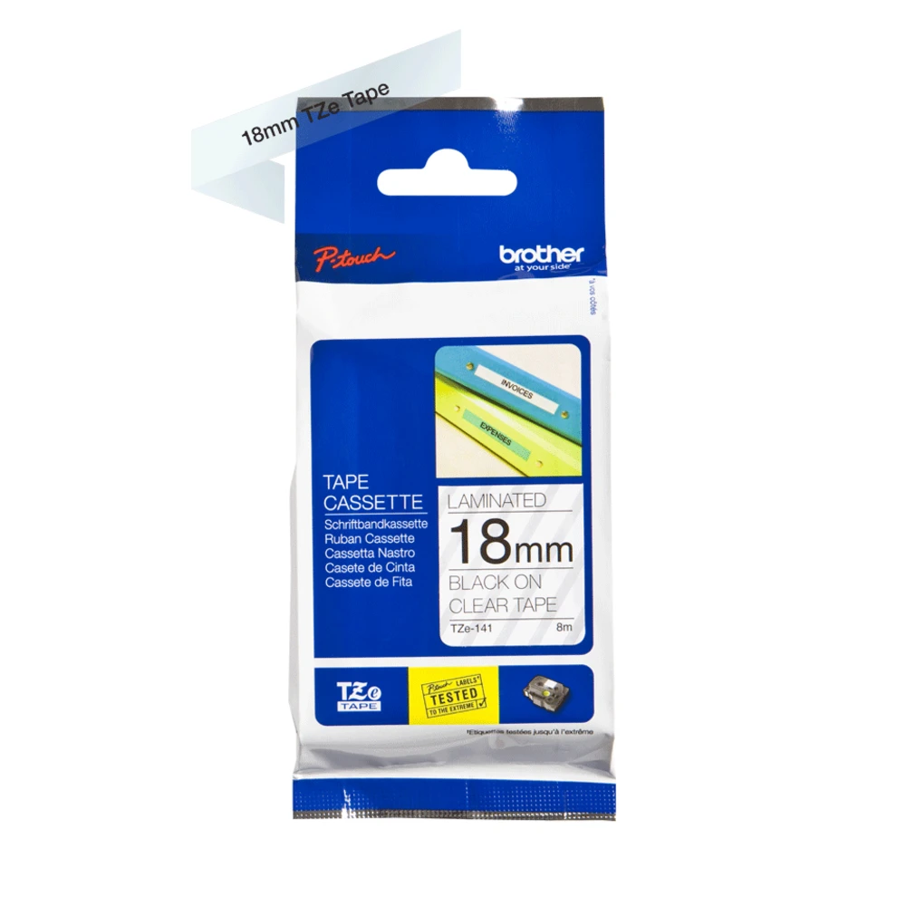 Brother TZE-141. Label colour: Black on transparent, Tape type: TZe, Print technology: Direct thermal. Tape width: 1.8 cm, Tape length: 8 m, Width: 23 mm. Tape size: 1.8 cm