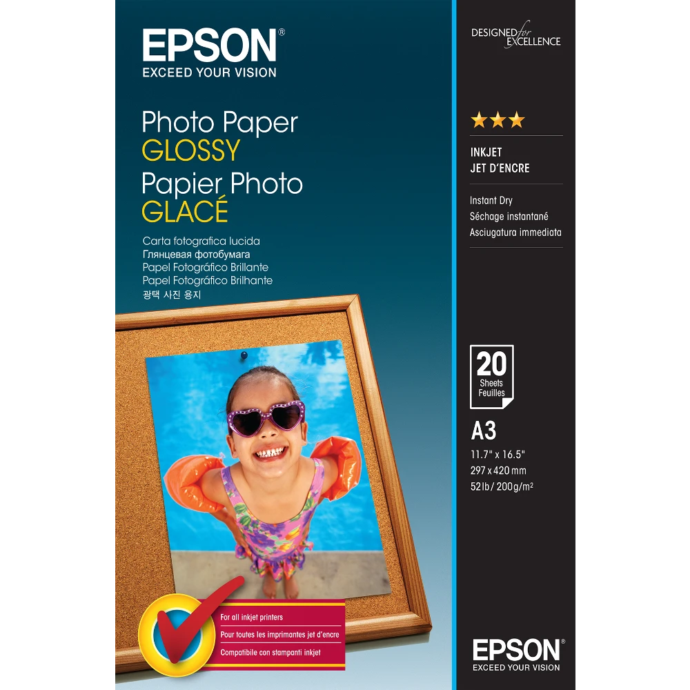 Photo Paper Glossy - A3 - 20 sheets Epson Photo Paper Glossy - A3 - 20 sheets. Finish type: Gloss, Media weight: 200 g/m², Paper size: A3. Quantity per pack: 1 pc(s), Package width: 310 mm, Package depth: 435 mm. Pallet width (UK): 100 cm, Pallet length (UK): 120 cm, Pallet height (UK): 36 cm. Country of origin: Japan Photos can bring back special and happy moments in an instant, so make the most of yours with this affordable glossy photo paper. There's no need to pick and choose; this low-cost yet high-quality photo paper means you can print all of your favourite photos. Fantastic, affordable photos