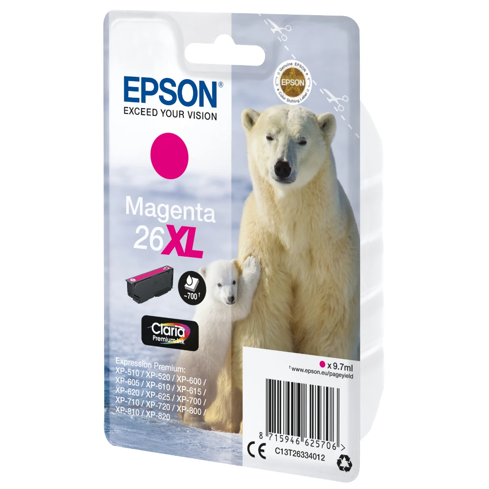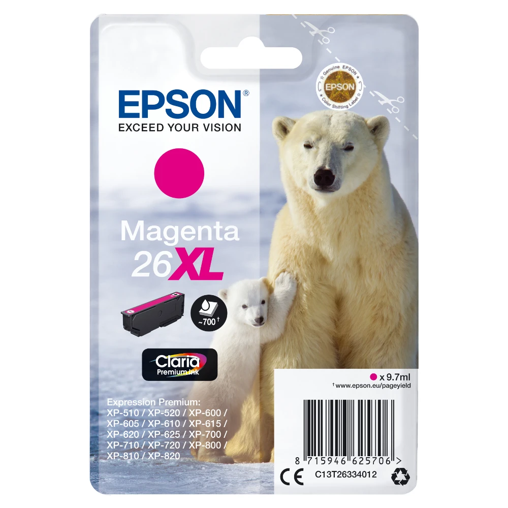 Epson Polar bear Singlepack Magenta 26XL Claria Premium Ink. Colour ink type: Pigment-based ink, Cartridge capacity: High (XL) Yield, Colour ink page yield: 700 pages, Colour ink volume: 9.7 ml, Printing colours: Magenta, Quantity per pack: 1 pc(s)