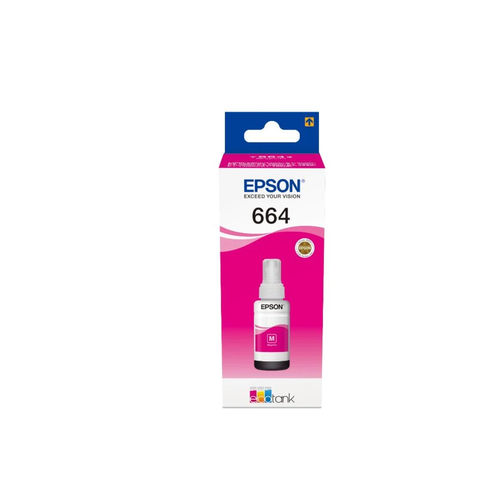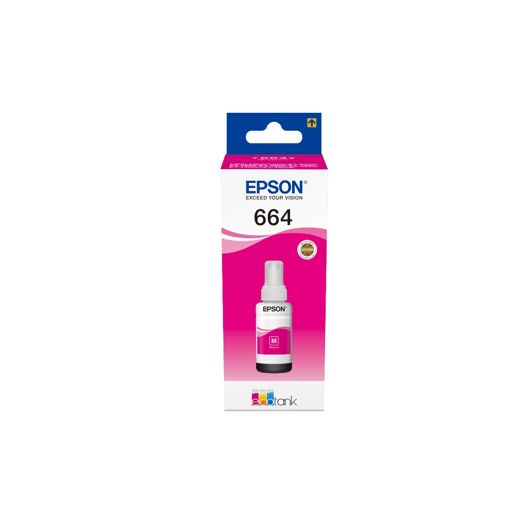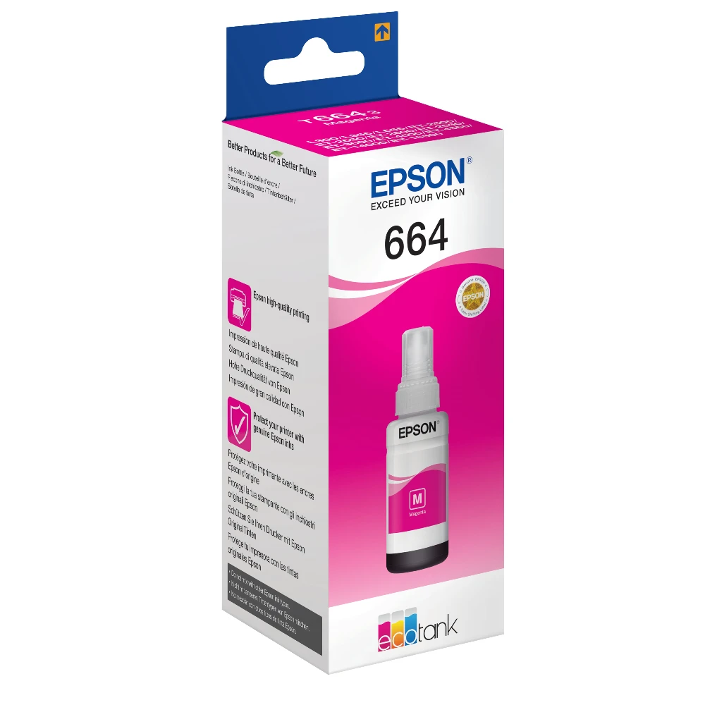 Epson 664 Ecotank Magenta ink bottle (70ml). Printing colours: Magenta, Brand compatibility: Epson, Compatibility: EcoTank L555 EcoTank L355 EcoTank ET-4550 EcoTank ET-4500 EcoTank ET-3600 EcoTank ET-2650 EcoTank.... Quantity per pack: 1 pc(s), Package width: 80 mm, Package depth: 145 mm. Products per pallet: 1260 pc(s), Pallet gross length: 120 cm, Pallet gross width: 80 cm