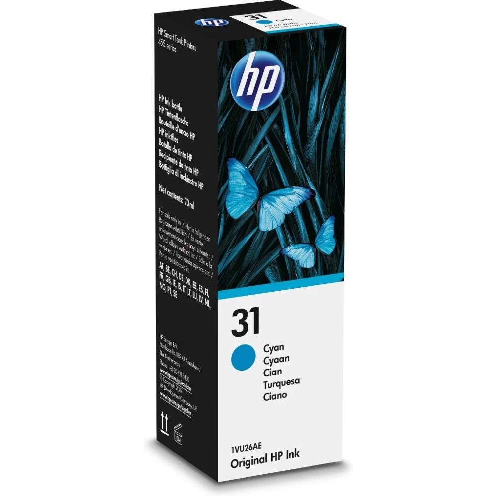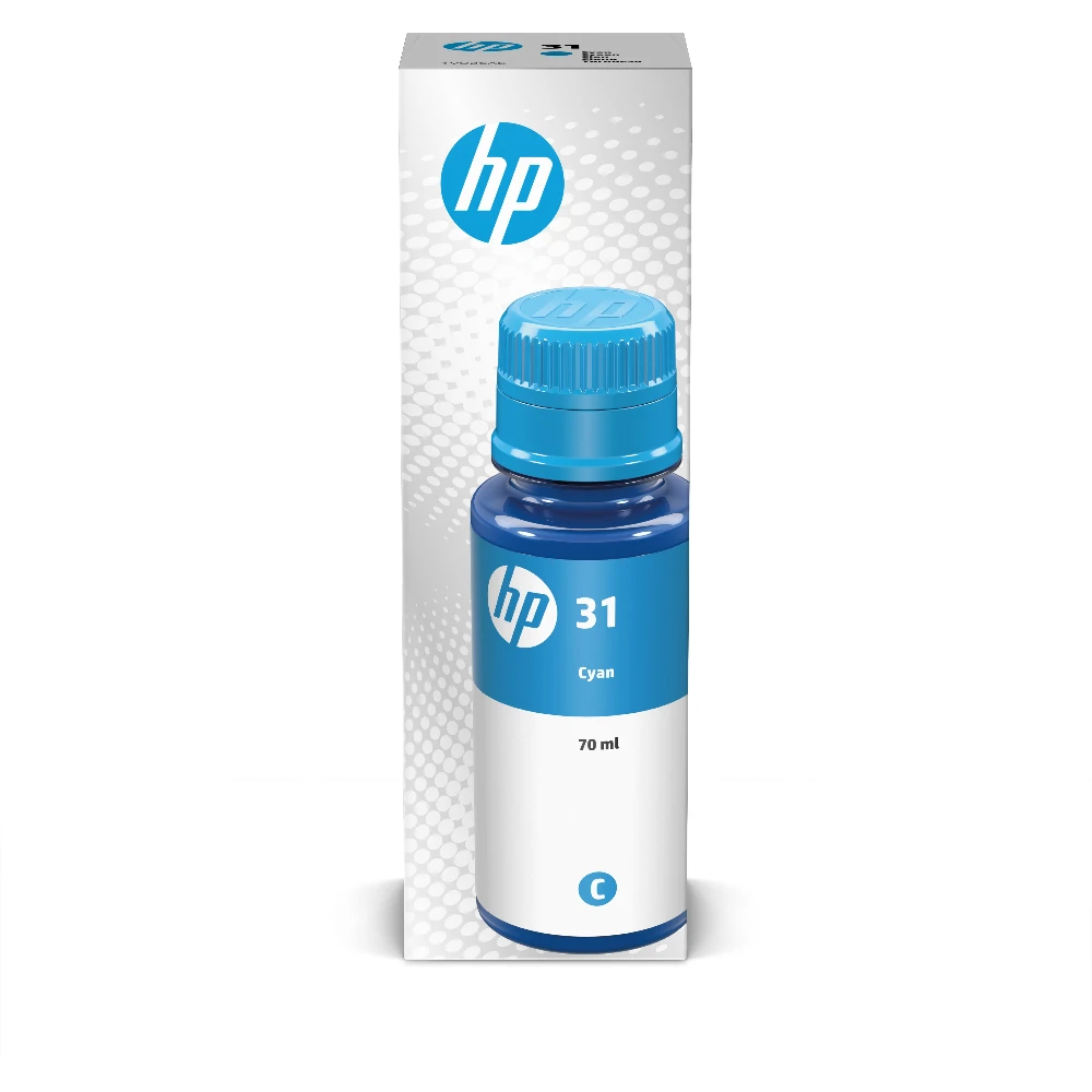HP 31 70-ml Cyan Original Ink Bottle. Printing colours: Cyan, Brand compatibility: HP, Compatibility: HP Ink Tank 310, HP Ink Tank Wireless 410, HP Smart Tank 350, HP Smart Tank Wireless 450, HP Smart.... Quantity per pack: 1 pc(s), Package width: 47 mm, Package depth: 47 mm. Master (outer) case gross weight: 2.89 g, Master (outer) case length: 217 mm, Master (outer) case width: 313 mm