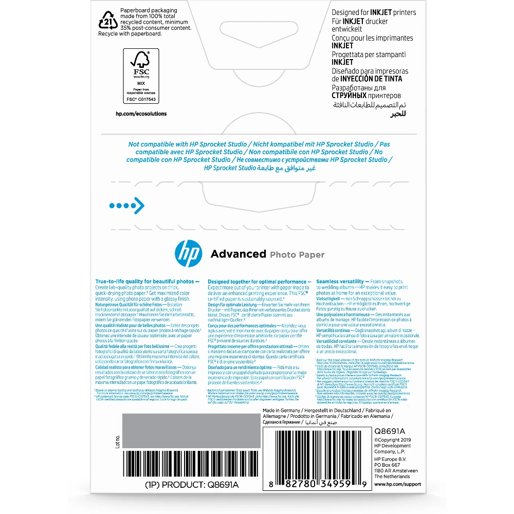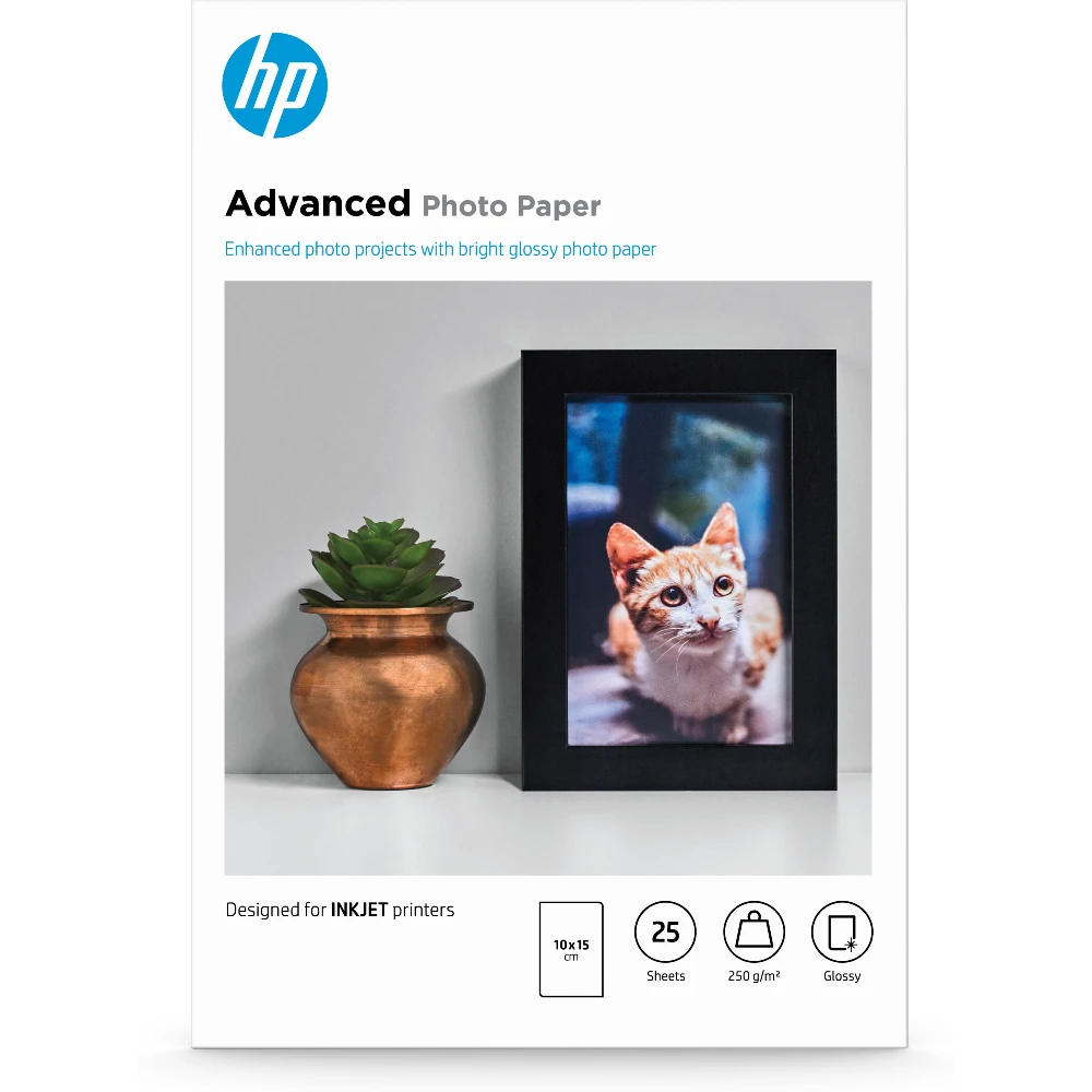 Advanced Photo Paper, Glossy, 250 g/m2, 10 x 15 cm (101 x 152 mm), 25 sheets HP Advanced Photo Paper, Glossy, 250 g/m2, 10 x 15 cm (101 x 152 mm), 25 sheets. Finish type: Gloss, Media weight: 250 g/m², Paper size: 10x15 cm. Width: 14.3 mm, Depth: 124 mm, Height: 181 mm. Quantity per pack: 1 pc(s), Package width: 182 mm, Package depth: 124 mm. Pallet gross weight: 119 g, Master (outer) cases per pallet: 56 pc(s), Layers per pallet: 2 pc(s). Pallet dimensions (W x D x H): 1133 x 781 x 433 mm Relive favorite memories with true-to-life photos Ideal for inkjet printer users and HP Inkjet printer owners printing high-quality, true-to-life photos for scrapbooking, photo albums, and framing.