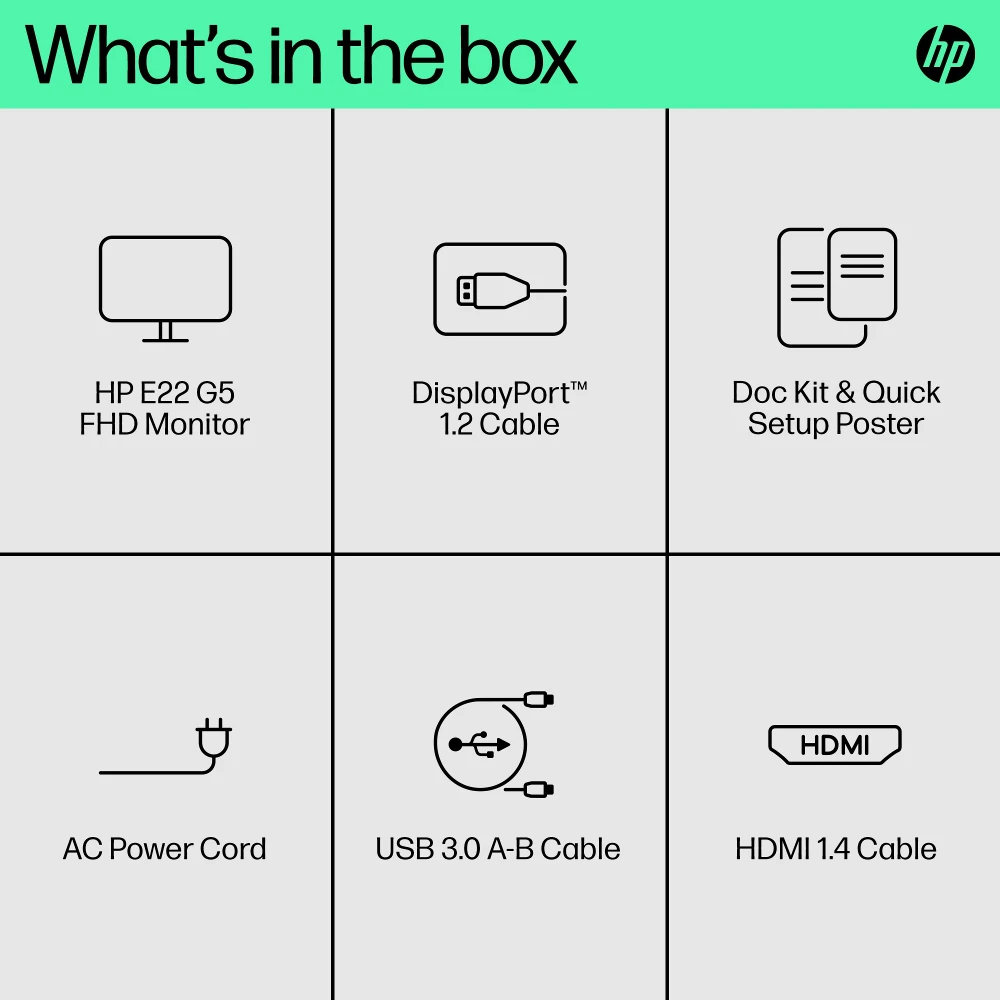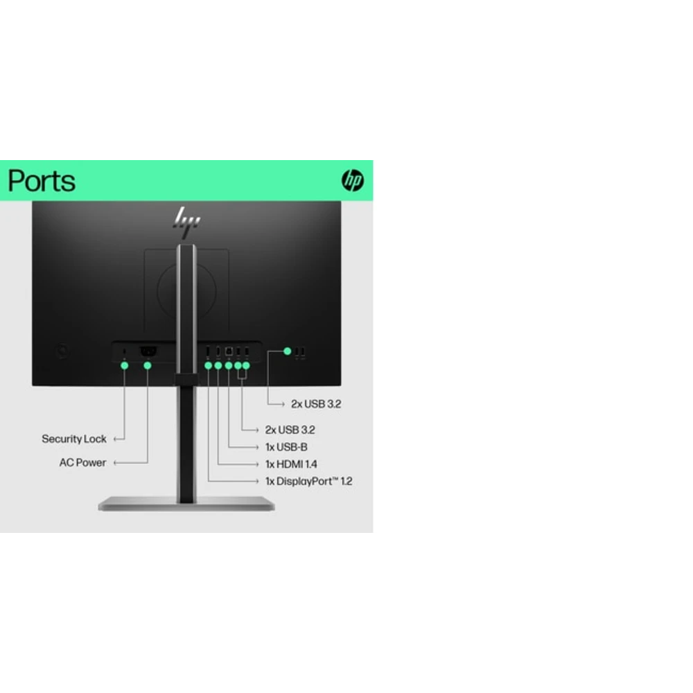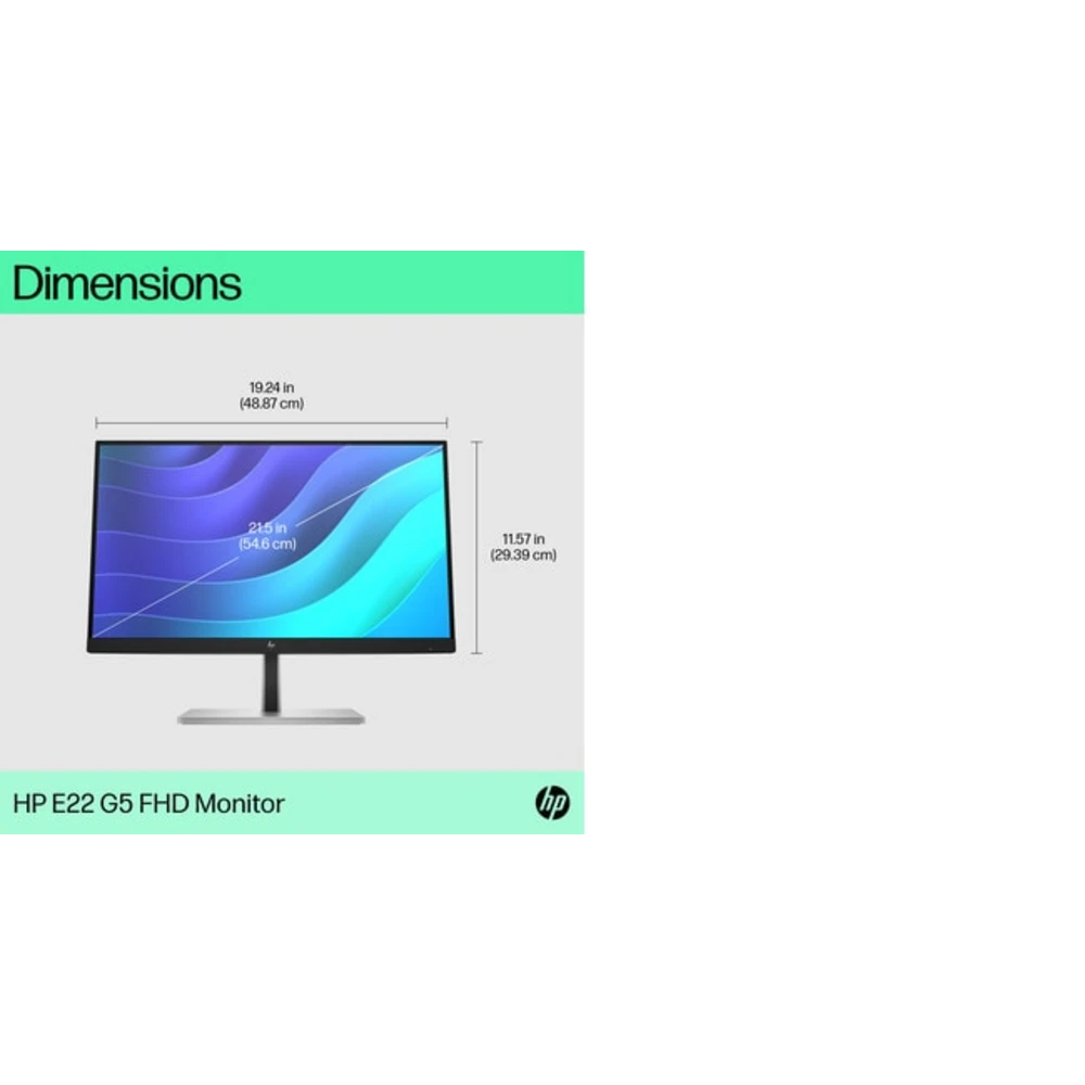 HP E-Series E22 G5. Display diagonal: 54.6 cm (21.5"), Display resolution: 1920 x 1080 pixels, HD type: Full HD, Display technology: LED, Response time: 5 ms, Native aspect ratio: 16:9, Viewing angle, horizontal: 178?, Viewing angle, vertical: 178?. Built-in USB hub. VESA mounting, Height adjustment. Product colour: Black, Silver