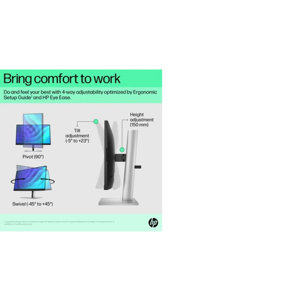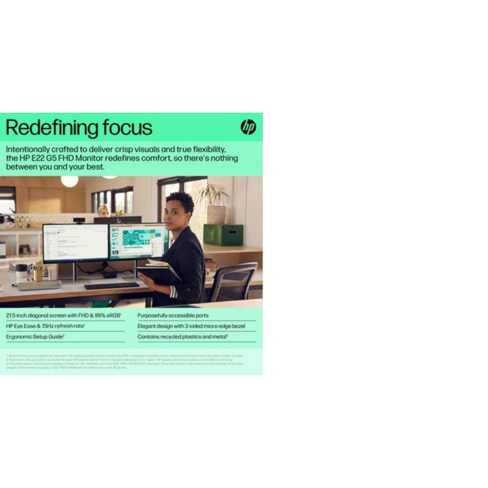 Intentionally crafted to deliver crisp visuals, personalized comfort, and true flexibility in the office or home, the HP E22 G5 FHD Monitor redefines comfort, so there's nothing between you and your best.