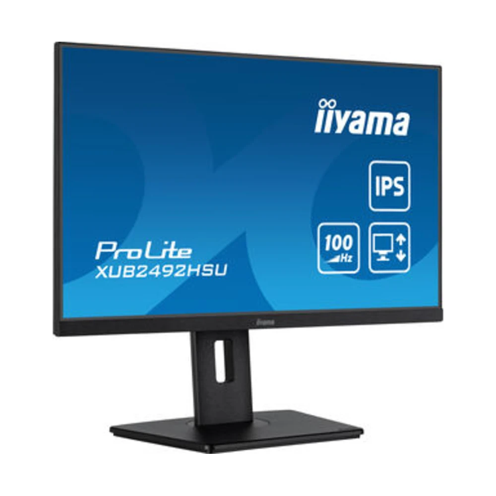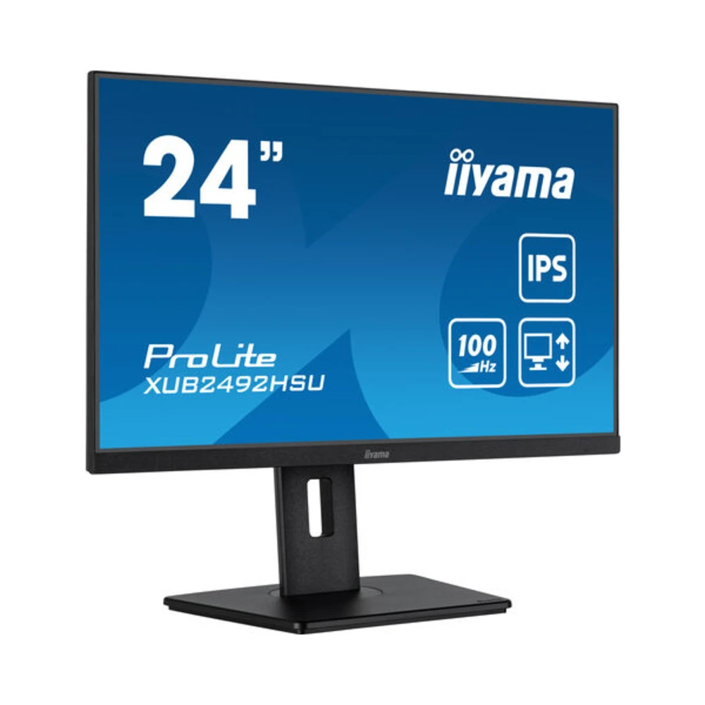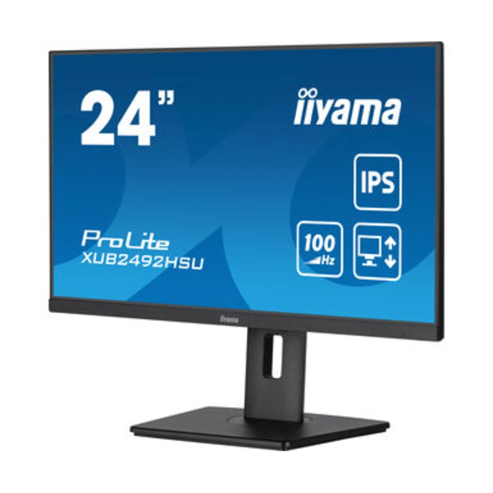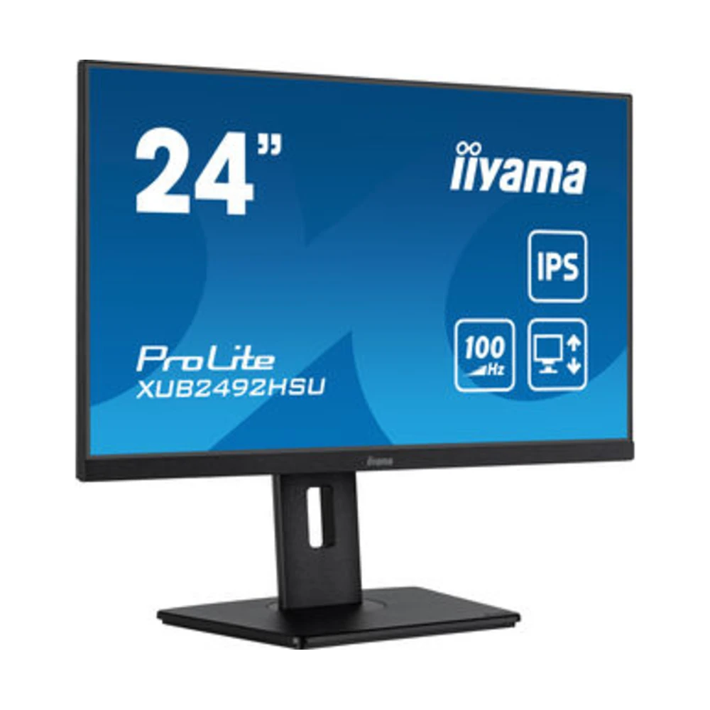 23.8", 1920 x 1080 @100Hz, 250 cd/m?, 16:9, IPS , 60.5cm iiyama XUB2492HSU-B6. Display diagonal: 60.5 cm (23.8"), Display resolution: 1920 x 1080 pixels, HD type: Full HD, Display technology: LED, Response time: 0.4 ms, Native aspect ratio: 16:9, Viewing angle, horizontal: 178?, Viewing angle, vertical: 178?. Built-in speaker(s). Built-in USB hub. VESA mounting, Height adjustment. Product colour: Black A 100Hz refresh rate translates into increased smoothness of the image. This means that flickering is reduced and therefore eye fatigue is also less noticeable. The increased frequency also means smoother transitions between contrasting colours, smoother motion scenes in both movies and gaming, and even reduced mouse cursor flickering.