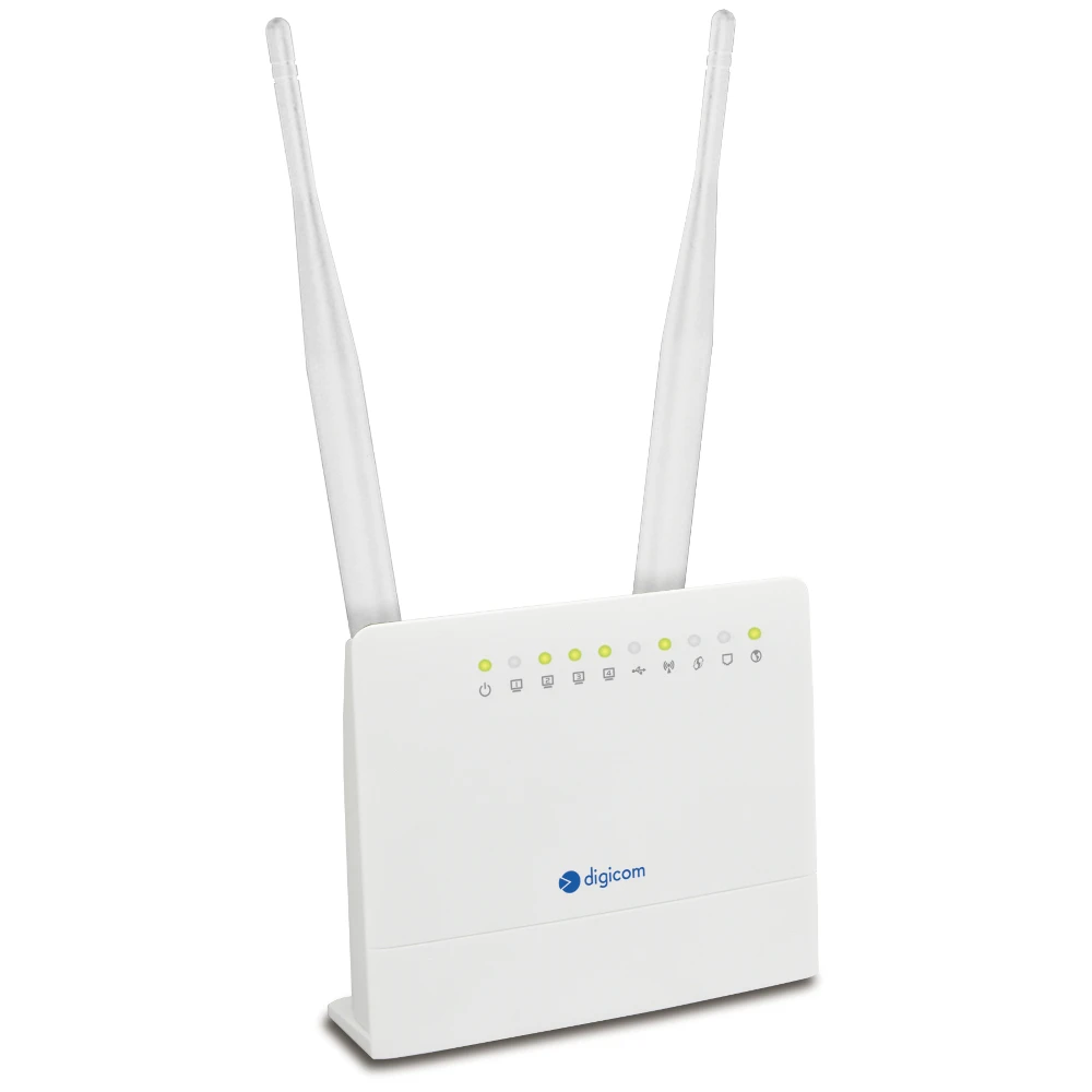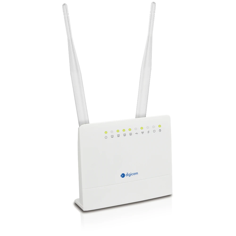 Digicom RAW300L-A05. Wi-Fi band: Single-band (2.4 GHz), Top Wi-Fi standard: Wi-Fi 4 (802.11n), WLAN data transfer rate (max): 300 Mbit/s. Ethernet LAN interface type: Fast Ethernet, Ethernet LAN data rates: 10,100 Mbit/s, Cabling technology: 10/100Base-T(X). Security algorithms: 64-bit WEP, 128-bit WEP, WPA-PSK, WPA2-PSK, WPS. Routing protocols: RIP-1, RIP-2, Management protocols: SNMP, UPnP, Supported network protocols: PPPoA, PPPoE, RFC1483, IPoA, IPoE. Product type: Tabletop router, Product colour: White, LED indicators: ADSL, LAN, Power, WLAN