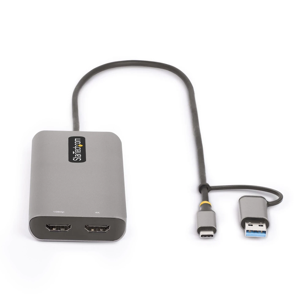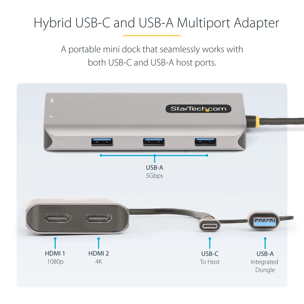 Add dual-HDMI monitors and 3x USB-A peripheral ports to a USB-C or USB-A-enabled laptopThis USB Type-C & USB Type-A Multiport Adapter turns almost any laptop or desktop into a high-productivity workstation that supports dual external HDMI displays and features a 3-port USB hub. The Mini Dock has a built-in 1.3ft (40cm) USB-C host cable and includes a tethered USB-C to USB-A adapter, so it can support both USB-C and USB-A host computers.Dual Display AdapterEnhance productivity with two HDMI output ports for connecting external monitors. The HDMI output ports support resolutions up to 4K 30Hz (Video Output 1, HDMI 1.4), and 1080p 60Hz (Video Output 2, HDMI 1.2). Dual external monitors increase productivity - enabling users to have different applications, documents, or windows open on each monitor.Wide-Range CompatibilityThe Multiport Adapter is compatible with Windows, macOS, and Chrome OS. With its tethered USB-C to USB-A dongle that ensures it ensures seamless USB compatibility with any host running a supported OS. The Multiport Adapter supports dual-extended displays on Apple M1/M2 MacBooks, which are not capable of driving more than one external display natively.Built-in 3-Port USB-A HubThe USB-C & USB-A Multiport Adapter features three downstream USB-A ports. For fast and reliable data transfers the built-in USB hub supports SuperSpeed USB 3.2 Gen 1 (5Gbps) and is backward compatible with legacy USB 2.0 and USB 1.1 (HID) devices.Enhance Productivity and Device Management with the StarTech.com Connectivity Tools ApplicationDeveloped to improve performance and security, StarTech.com Connectivity Tools is the only software suite on the market that is compatible with a wide variety of IT connectivity accessories. The software suite includes:?Advanced Windows Layout Utility : Setup and save custom windows layouts.?USB Event Monitoring Utility : Track and log connected USB devices.For more information and to download the StarTech.com Connectivity Tools application, please visit: www.startech.com/connectivity-toolsThe StarTech.com Advantage