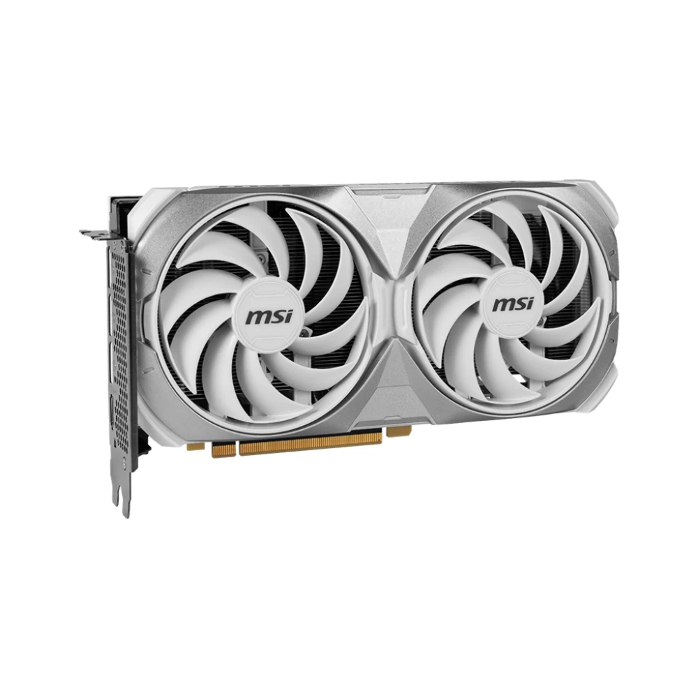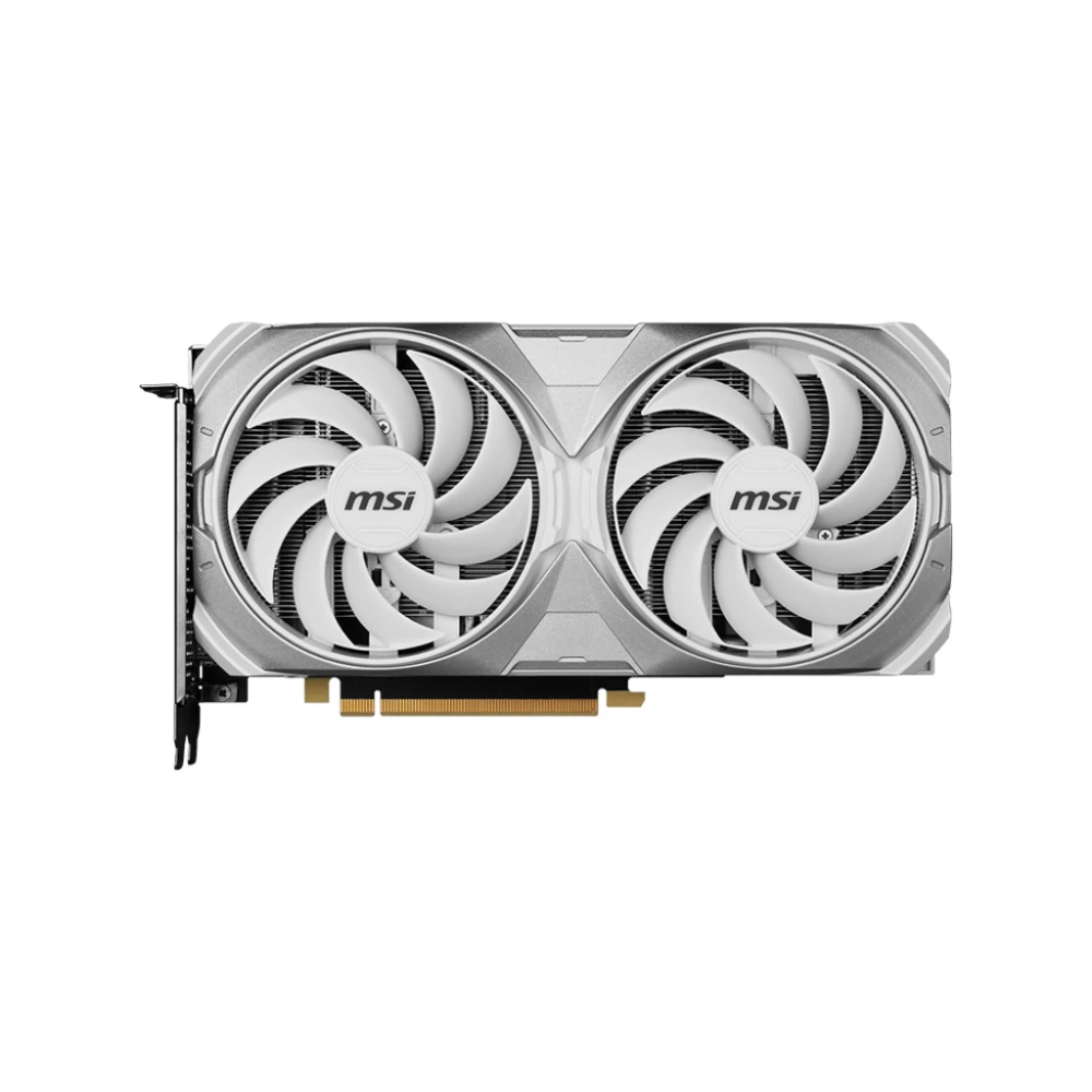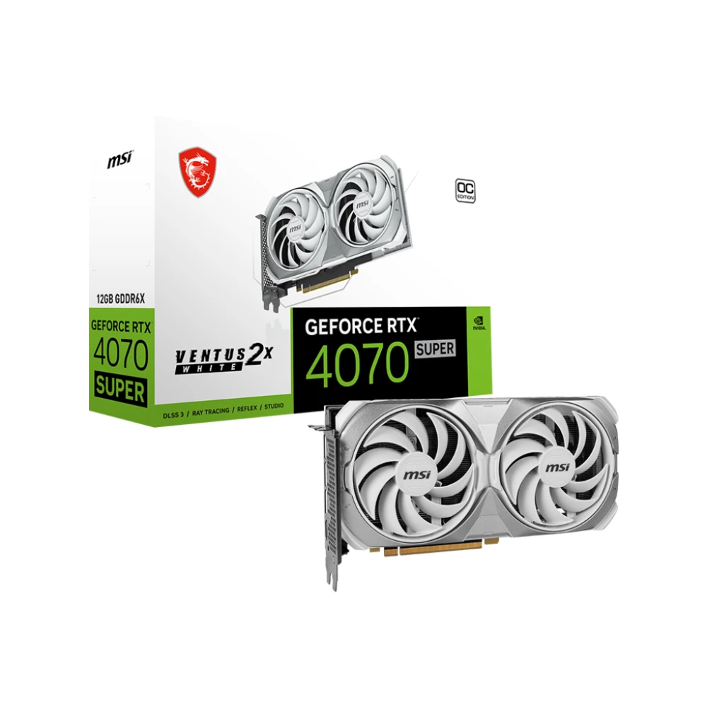 NVIDIA GeForce RTX 4070 SUPER, 2520MHz, 12GB GDDR6X, 192 bit, PCI Express 4.0, 1 x HDMI (1.2a), 3 x DP (1.4a), CUDA, DirectX 12 Ultimate, OpenGL 4.6, 220W MSI GeForce RTX 4070 SUPER 12G VENTUS 2X WHITE OC. Graphics processor family: NVIDIA, Graphics processor: GeForce RTX 4070 SUPER, Processor frequency: 2520 MHz. Discrete graphics card memory: 12 GB, Graphics card memory type: GDDR6X, Memory bus: 192 bit. Maximum resolution: 7680 x 4320 pixels. DirectX version: 12 Ultimate, OpenGL version: 4.6. Interface type: PCI Express 4.0. Cooling type: Active, Number of fans: 2 fan(s) TAKE THE ESSENTIALS