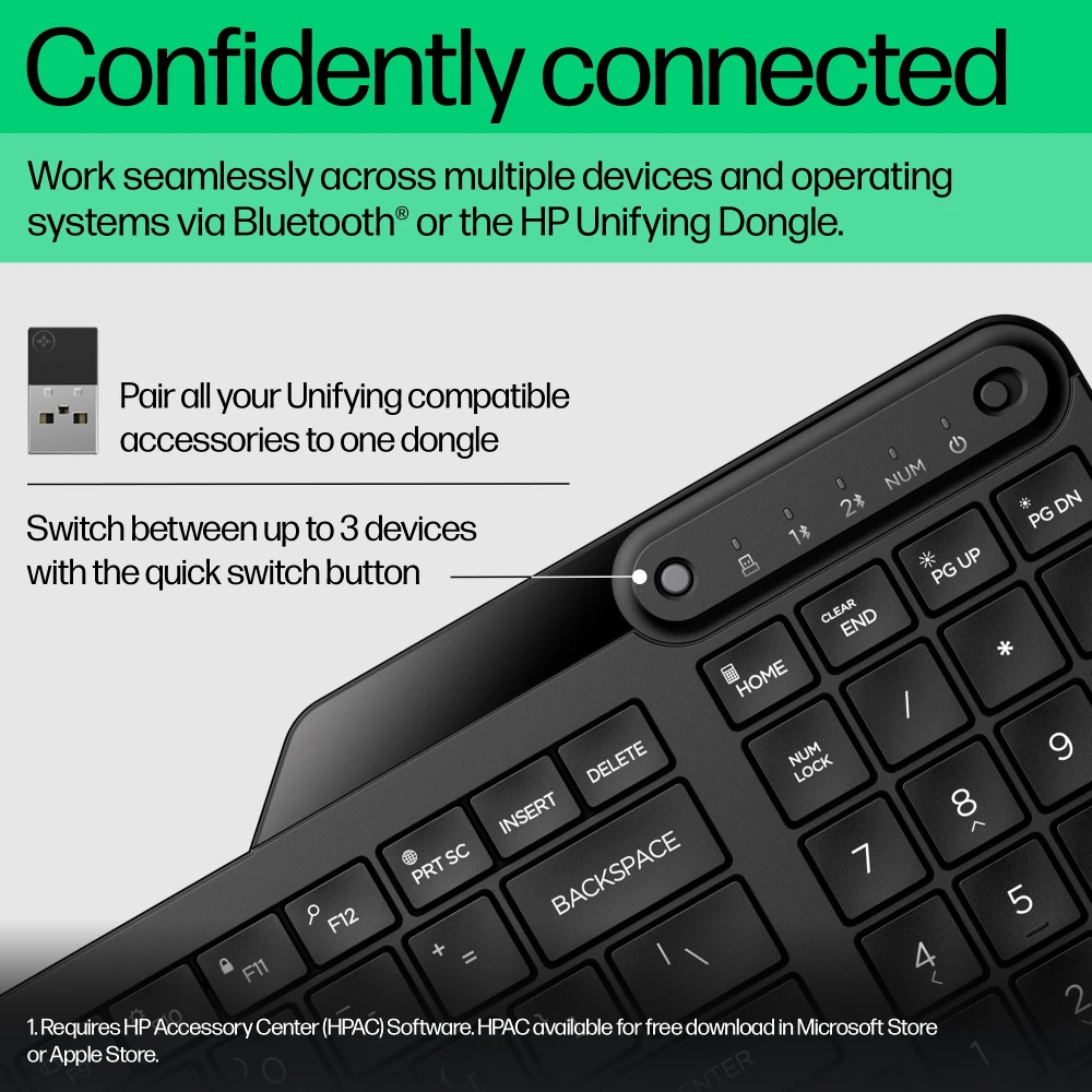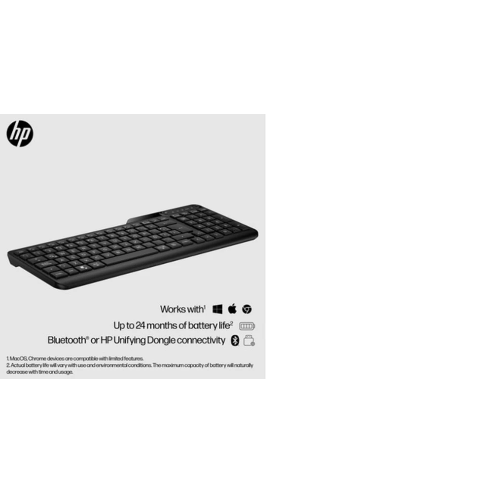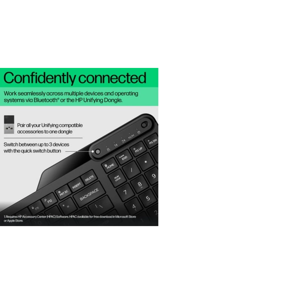 Be ready to handle anything with the HP 475 Dual-Mode Wireless Keyboard. It offers full-sized office functionality that?s easy to pack up for wherever work takes you. Functional yet portable, versatile with enhanced security, this true multi-device keyboard is built to help you stay moving, working, and connected.
