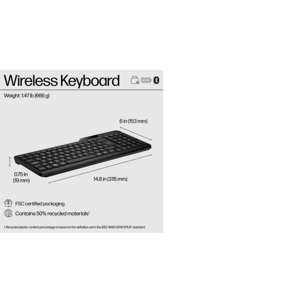 HP 475 Dual-Mode Wireless Keyboard. Keyboard form factor: Full-size (100%), Device interface: RF Wireless + Bluetooth, Keyboard key switch: Membrane, Recommended usage: Universal. Product colour: Black