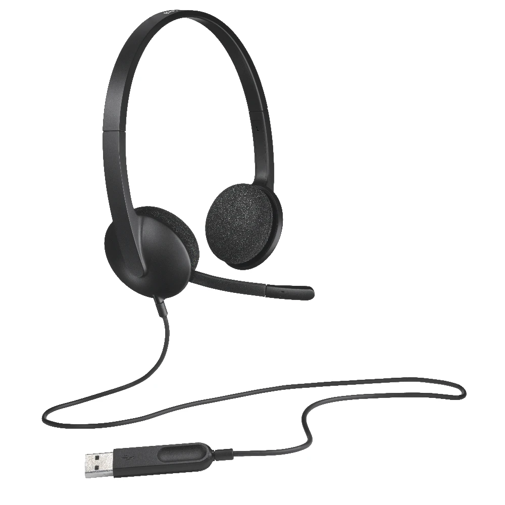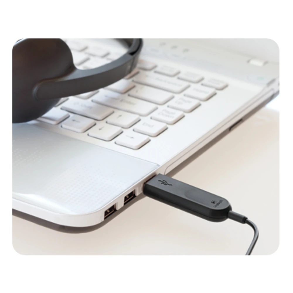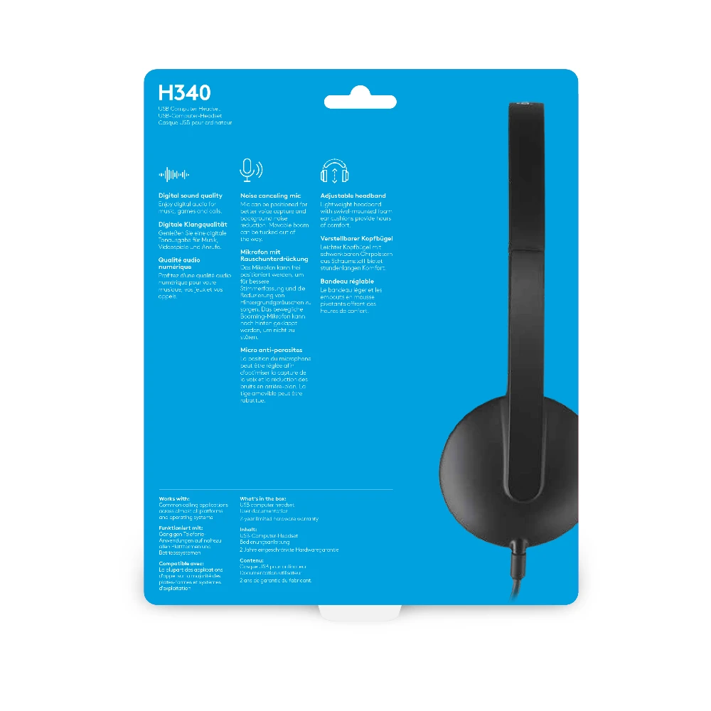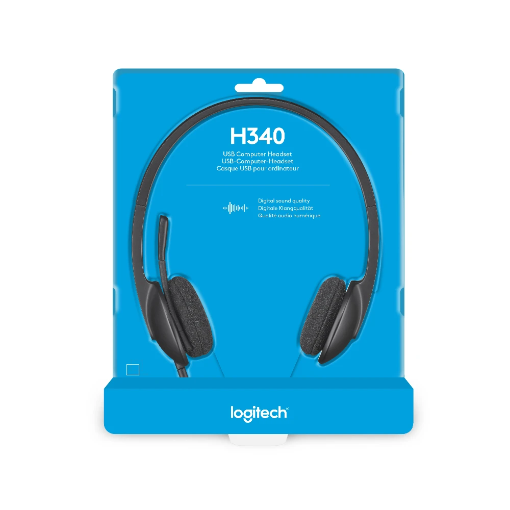 H340 USB Computer Headset Logitech H340 USB Computer Headset. Product type: Headset. Connectivity technology: Wired. Recommended usage: Office/Call center. Headphone frequency: 20 - 20000 Hz. Cable length: 1.8 m. Weight: 100 g. Product colour: Black The perfect everyday headset with a simple plug-and-play USB connection. A noise-canceling microphone reduces background noise and delivers clear digital audio for VOIP and Skype calls. The perfect everyday headset with a simple plug-and-play USB connection. Without the need to install software, you’re ready to go. A noise-canceling microphone reduces background noise and delivers clear digital audio for VOIP and Skype calls. Discreet and right-sided boom can be tucked inside the headband and out of the way when you’re not using it. Lightweight and adjustable headband with swivel-mounted foam ear cushions feel comfortable even after long hours of use.