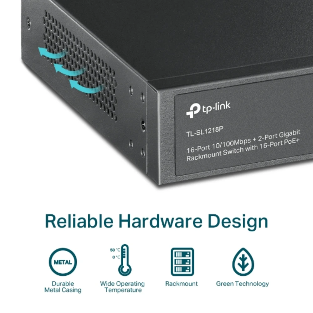 7.2 Gbps, 5.36 Mpps, 16x 10/100 Mbps RJ-45, 2x 1G RJ-45, 1x Combo SFP, 440x180x44 mm TP-Link 16-Port 10/100 Mbps + 2-Port Gigabit Rackmount PoE Switch with 16-Port PoE+. Switch type: Unmanaged. Basic switching RJ-45 Ethernet ports type: Gigabit Ethernet (10/100/1000), Basic switching RJ-45 Ethernet ports quantity: 18. MAC address table: 8000 entries, Switching capacity: 7.2 Gbit/s. Networking standards: IEEE 802.3af, IEEE 802.3at, IEEE 802.3x. Power over Ethernet (PoE). Rack mounting, Form factor: 1U Professional 16-Port 10/100 Mbps + 2-Port Gigabit Rackmount Switch with 16-Port PoE+