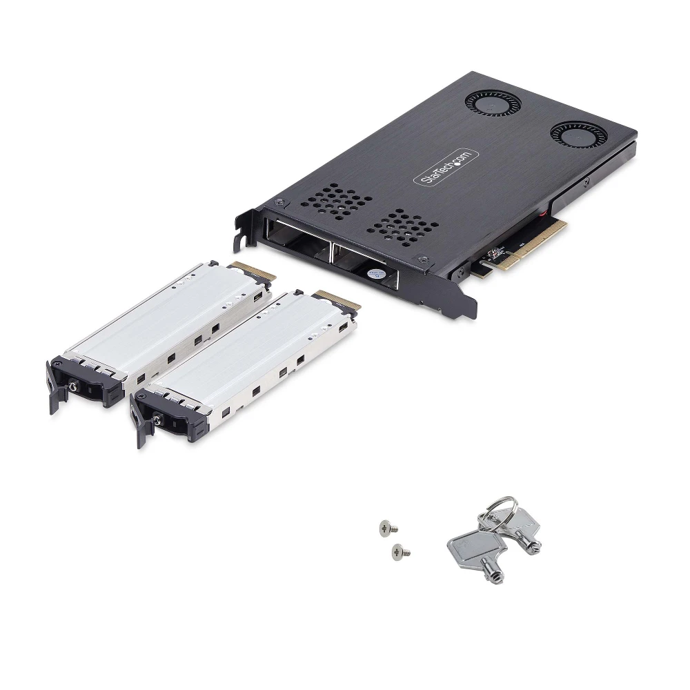 StarTech.com Dual-Bay M.2 NVMe SSD to PCIe x8 Removable Mobile Rack; PCI Express Bifurcation Required; Tool-less Install StarTech.com Dual-Bay M.2 NVMe SSD to PCIe x8 Removable Mobile Rack; Bifurcation Required; Tool-less Installation, PCIe Backplane w/Two Hot-Swap Drive Bays. Type: Backplane, Product colour: Black, SSD interface: M.2. Host interface: PCI Express. Width: 186 mm, Depth: 121 mm, Height: 19 mm. Package width: 230 mm, Package depth: 151 mm, Package height: 46 mm. Number of lock keys included: 2 pc(s) - Utilize a PCIe x8/x16 slot as a removable drive bay for 2x M.2 NVMe SSDs (up to 2280); Capable of read/write speeds up to 64Gbps per drive - Toolless installation of drive to tray/tray to bay; Lockable Drive Tray (2 keys incl.) - Vented frame/active cooling fans aid heat dissipation; Thermal pad/anti-vibration springs on tray - No drivers required; PCI Express 4.0/3.0; PCIe bifurcation required; Not compatible with M.2 SATA drives; Additional drive trays sold separately (TR-M2-REMOVABLE-PCIE) Use an available PCIe x8 or larger expansion slot to create two removable M.2 NVMe drive bays
