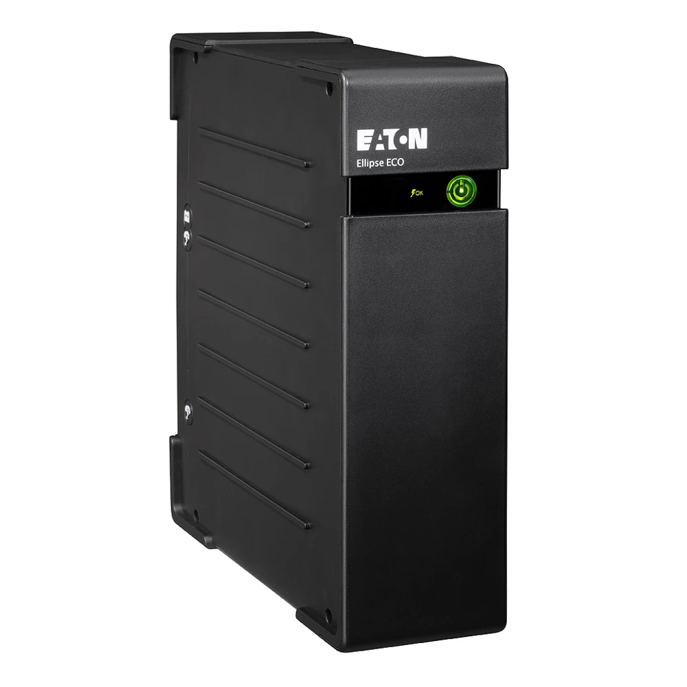 Ellipse ECO 500 DIN Eaton Ellipse ECO 500 DIN. UPS topology: Standby (Offline), Output power capacity: 0.5 kVA, Output power: 300 W. AC outlet types: Type F, Power plug: C14 coupler, AC outlets quantity: 4 AC outlet(s). Battery technology: Sealed Lead Acid (VRLA), Typical backup time at half load: 9 min. Form factor: Tower, Product colour: Black, Rack capacity: 2U. Width: 81 mm, Depth: 235 mm, Height: 263 mm The Eaton Ellipse ECO is a slim-line power protection with built-in high performance surge-protection device (compliant with IEC 61643-1 standard). With an efficient electrical design and the EcoControl function (USB models) the Eaton Ellipse ECO helps you make energy savings of up to 25 per cent compared to previous-generation UPSs.