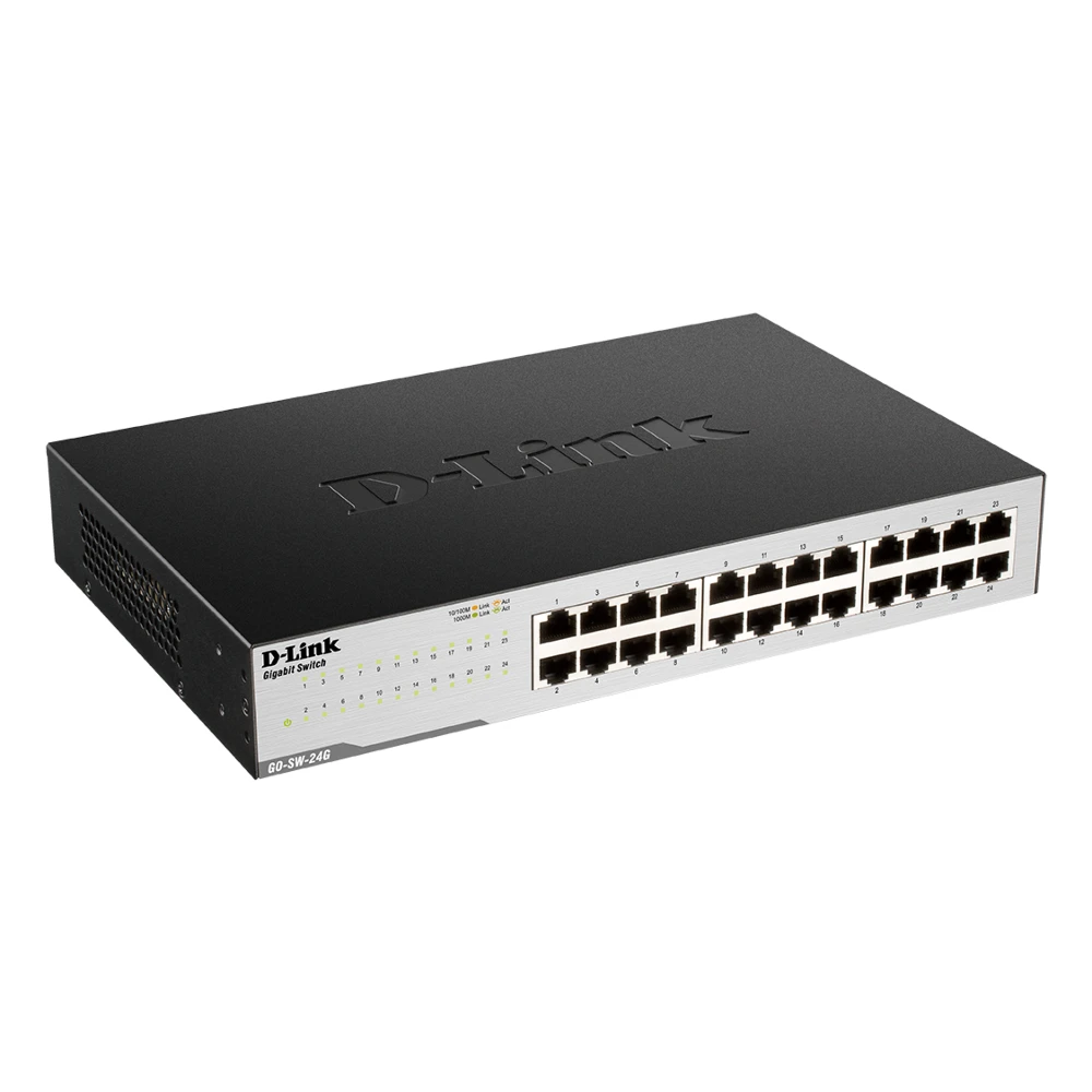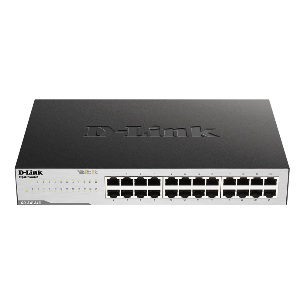 D-Link GO-SW-24G. Switch type: Unmanaged, Switch layer: L2. Basic switching RJ-45 Ethernet ports type: Gigabit Ethernet (10/100/1000), Basic switching RJ-45 Ethernet ports quantity: 24. Full duplex. MAC address table: 8000 entries, Switching capacity: 48 Gbit/s. Networking standards: IEEE 802.1p, IEEE 802.3, IEEE 802.3ab, IEEE 802.3az, IEEE 802.3u, IEEE 802.3x. Rack mounting, Form factor: 1U