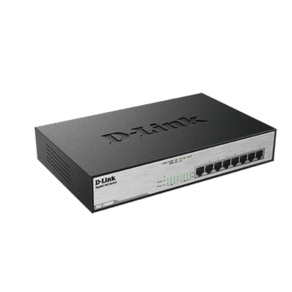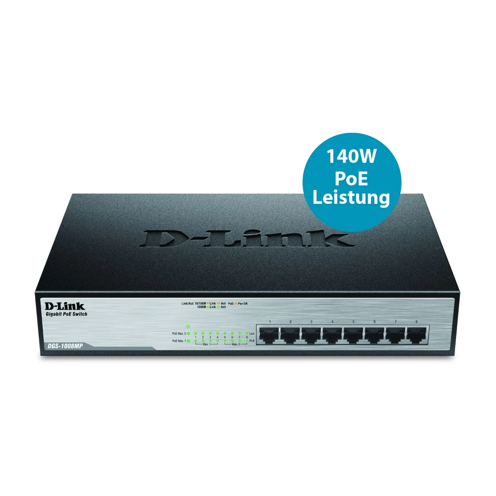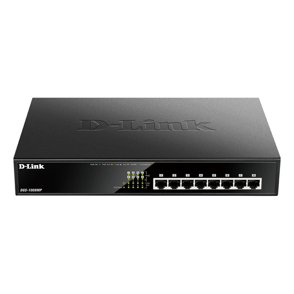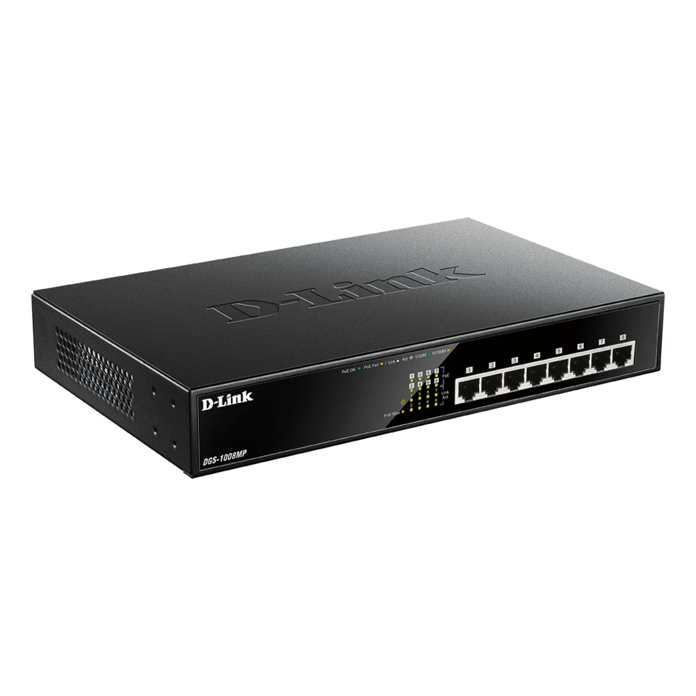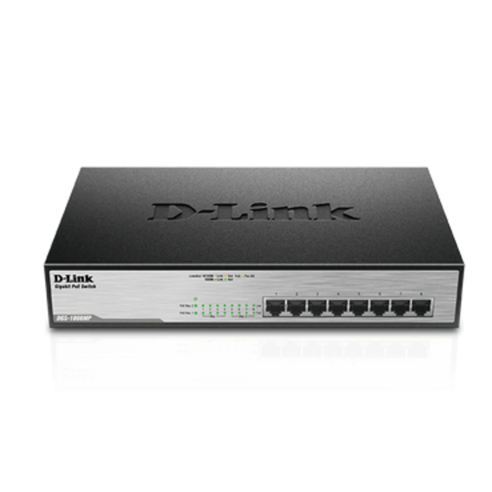 D-Link DGS-1008MP 8-Port Desktop Gigabit Max PoE Switch. Switch type: Unmanaged. Basic switching RJ-45 Ethernet ports type: Gigabit Ethernet (10/100/1000), Basic switching RJ-45 Ethernet ports quantity: 8. Full duplex. MAC address table: 8000 entries, Switching capacity: 16 Gbit/s. Networking standards: IEEE 802.3ab, IEEE 802.3at, IEEE 802.3az, IEEE 802.3i, IEEE 802.3u, IEEE 802.3x. Power over Ethernet (PoE). Rack mounting, Form factor: 1U