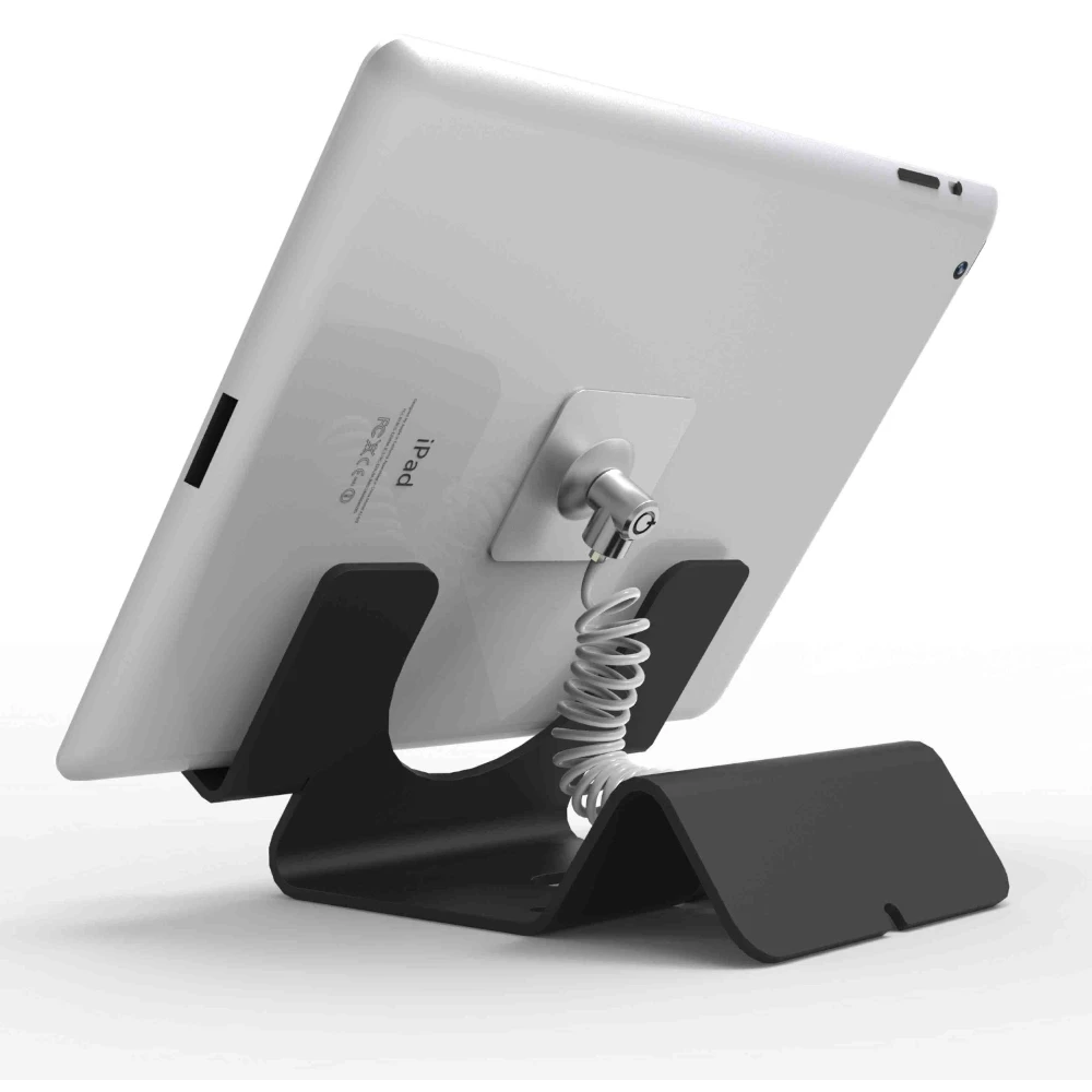 The simplified design still has its unique features that distinguish it from the cluttered pack of tablet stands on the market. Positioned at a 45 degree angle for optimal viewing with an open back design to fit the locking point and security cable. The stand has a patented balance stabilizer that serves as a cable trap to keep your cords in order and from being stolen.