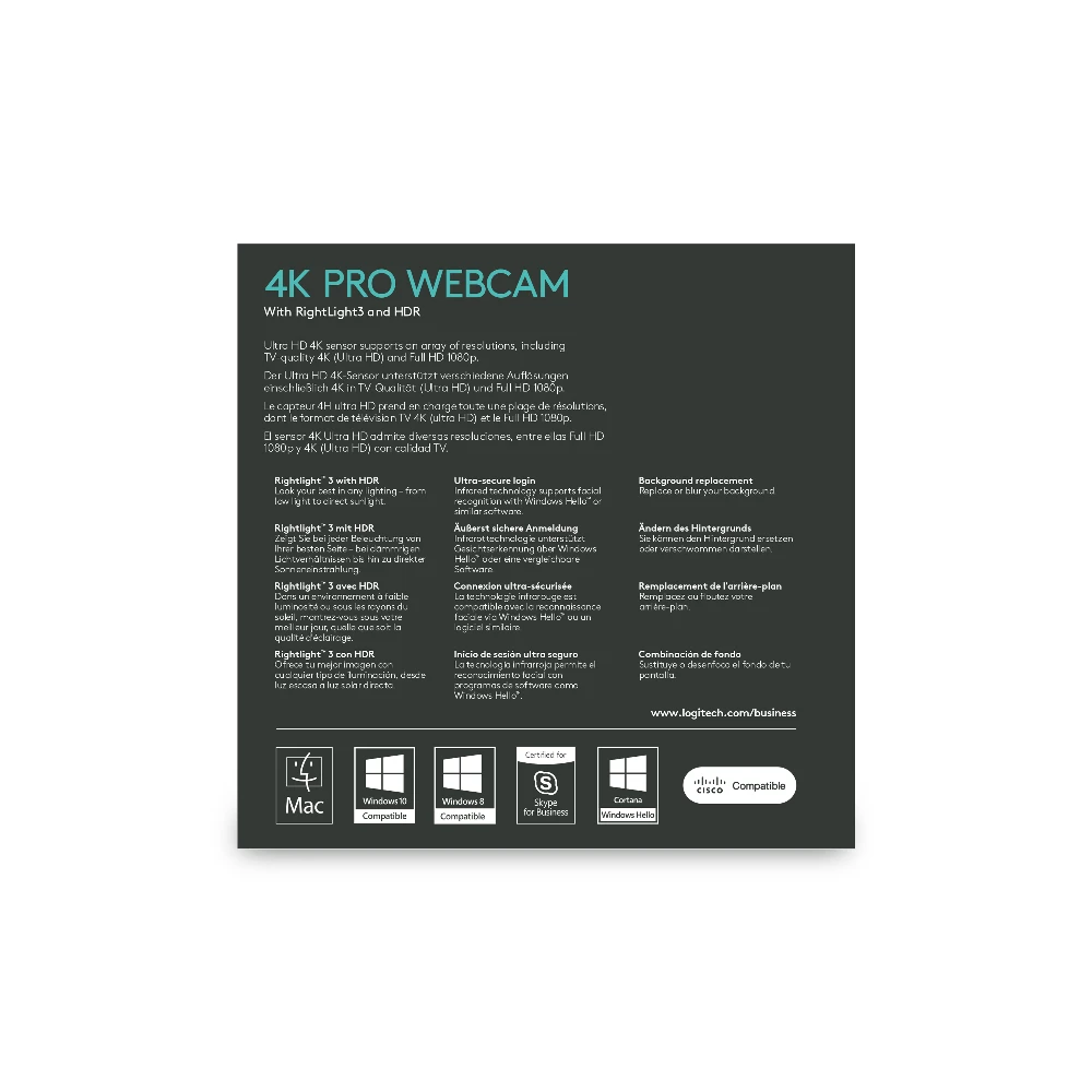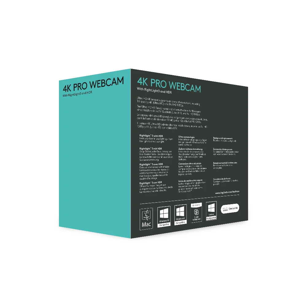 Logitech BRIO ULTRA HD PRO BUSINESS WEBCAM. Megapixel (approx.): 13 MP, Maximum video resolution: 4096 x 2160 pixels, Camera HD type: Full HD. Interface: USB 3.2 Gen 1 (3.1 Gen 1), Product colour: Black, Mounting type: Clip/Stand. Windows operating systems supported: Windows 10, Windows 11, Windows 8, Windows 8.1, Mac operating systems supported: Mac OS X 10.10 Yosemite, Mac OS X 10.11 El Capitan, Mac OS X 10.12 Sierra, Mac OS X 10.13 High..., Other operating systems supported: ChromeOS. Width: 102 mm, Depth: 27 mm, Height: 27 mm. Package width: 80 mm, Package depth: 136 mm, Package height: 136 mm