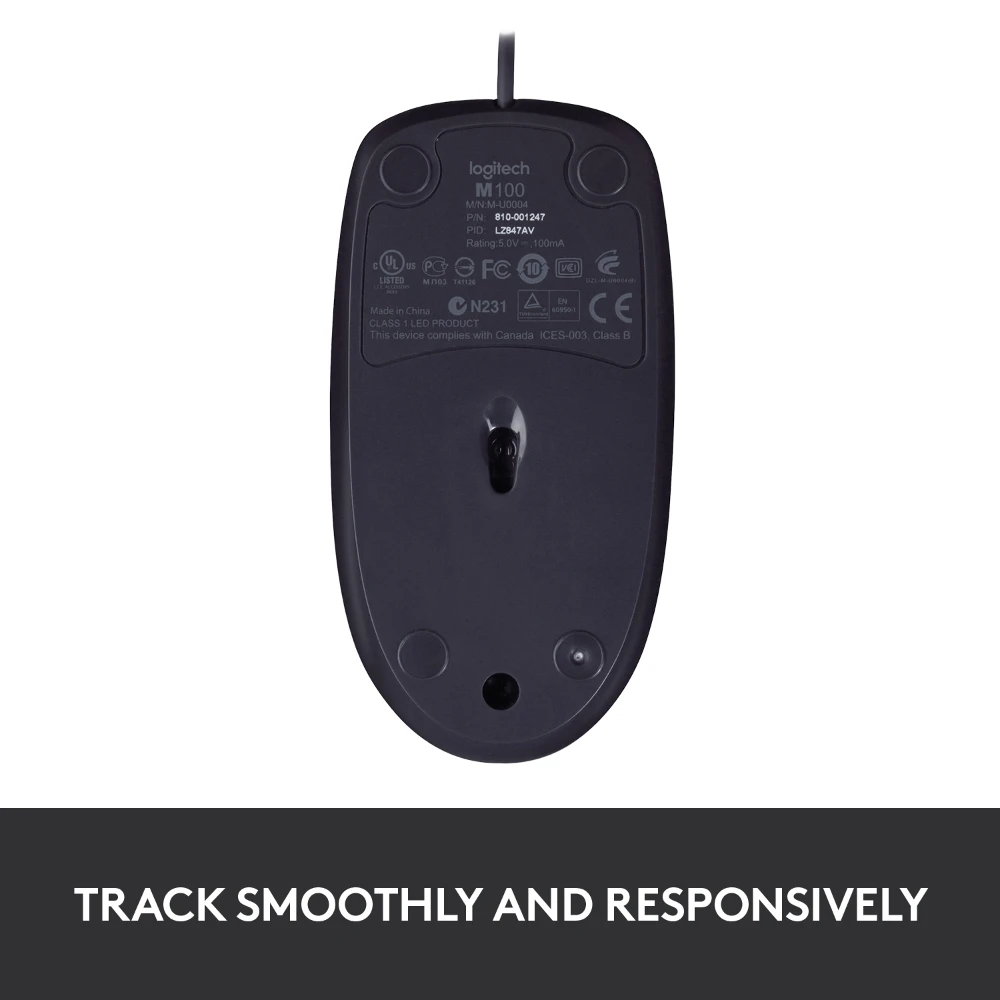 Mouse M100 Logitech Mouse M100. Form factor: Ambidextrous. Movement detection technology: Optical, Device interface: USB Type-A, Movement resolution: 1000 DPI, Buttons type: Pressed buttons, Buttons quantity: 3, Scroll type: Wheel. Power source: Cable. Product colour: Grey Logitech® Mouse M100 gives you just the basics for comfortable, reliable control of your computer. It’s built by Logitech®—the mouse experts and comes with the quality we’ve built into more than a billion mice. Logitech® Mouse M100 gives you just the basics for comfortable, reliable control of your computer. It’s built by Logitech®—the mouse experts—and comes with the quality we’ve built into more than a billion mice. There’s no software to install. And since it’s corded, you can just plug the cable into a USB port and use it right away. The full-size, ambidextrous shape means your hand will rest comfortably, while high-definition optical tracking (1000 dpi) means you’ll get responsive, smooth cursor control for precise tracking and easy text selection.