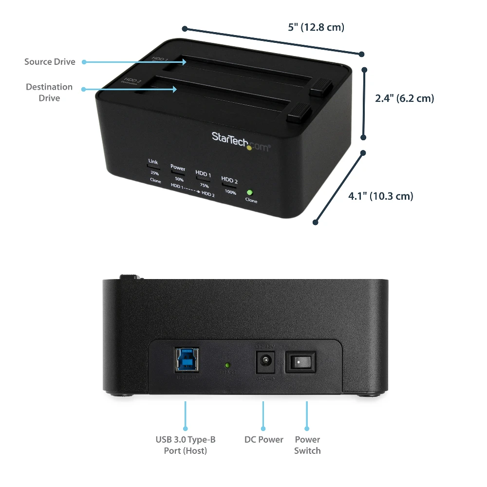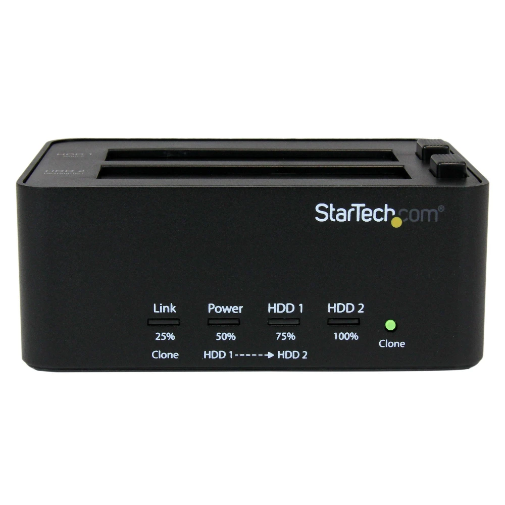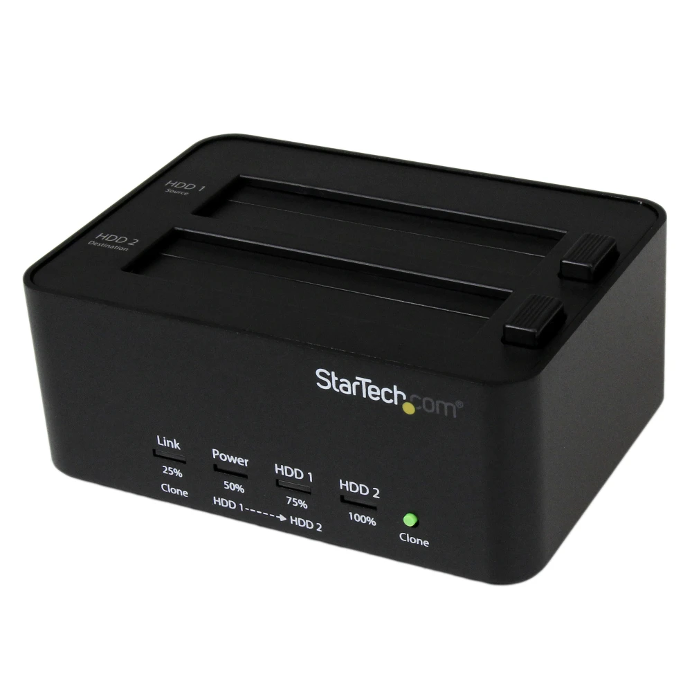 - Functions as a 2.5/3.5" HDD/SSD SATA drive disk cloner (no PC required) or file transfer / backup access over USB to two 2.5/3.5" SATA drives (HDD/SSD) -11 GB/min copy speed. Sector-by-sector entire disk copy. Features NIST SP 800-88 Rev 1 Single-Pass Overwrite (clear) - Toolless top slot loading w/ eject buttons. Multi-function LEDs - SATA I/II/III | No capacity limit | USB 3.2 Gen1 (5 Gbps) | OS Independent - Includes 3ft (0.9m) USB-A cable & Universal Power Adapter
