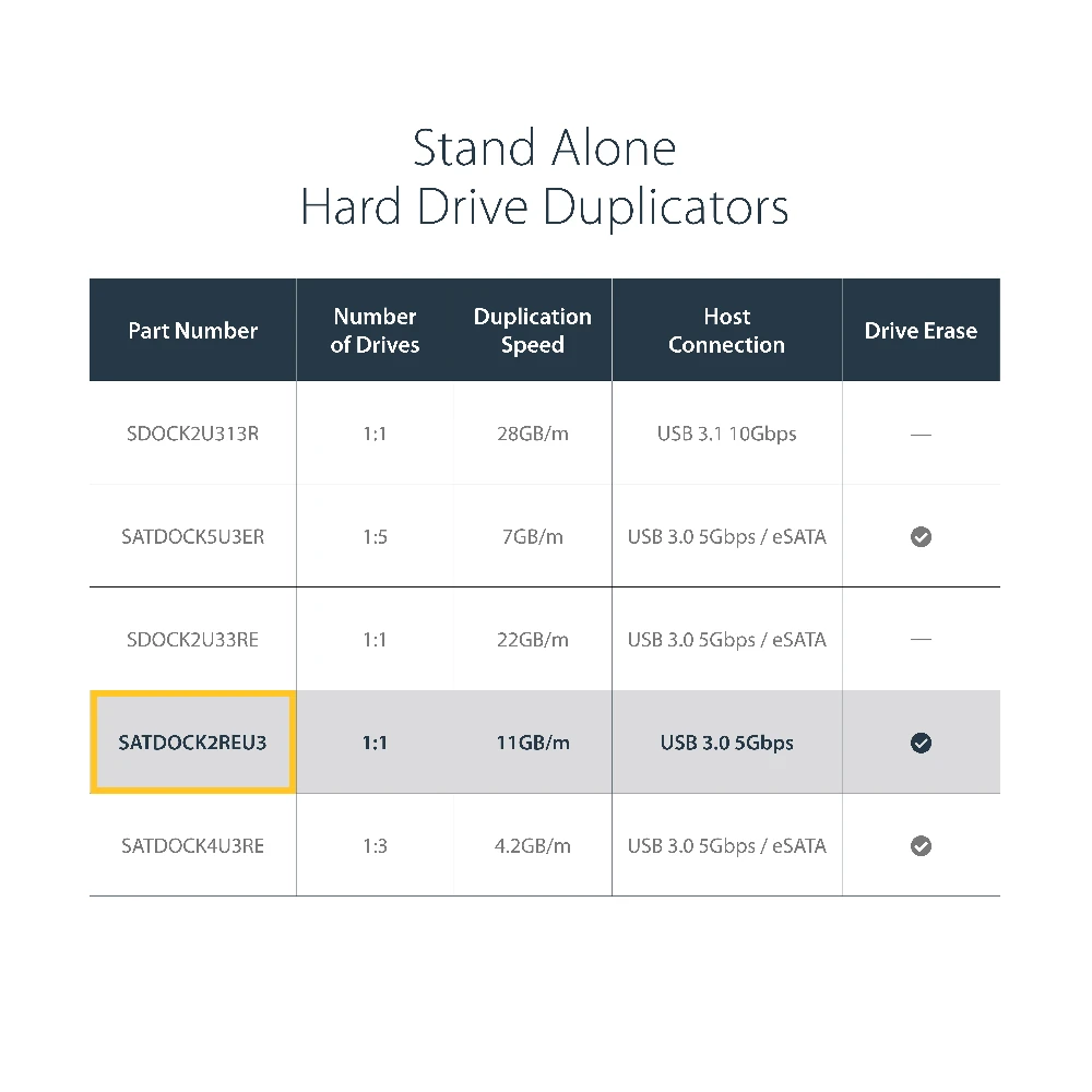 The SATDOCK2REU3 USB 3.0 Standalone Duplicator and Eraser Dock lets you connect your 2.5in/3.5in SATA HDDs or SSDs through SuperSpeed USB 3.0, with the ability to swap drives in and out as needed. The dock also functions as a standalone drive duplicator and eraser - an efficient and versatile solution for external drive management.