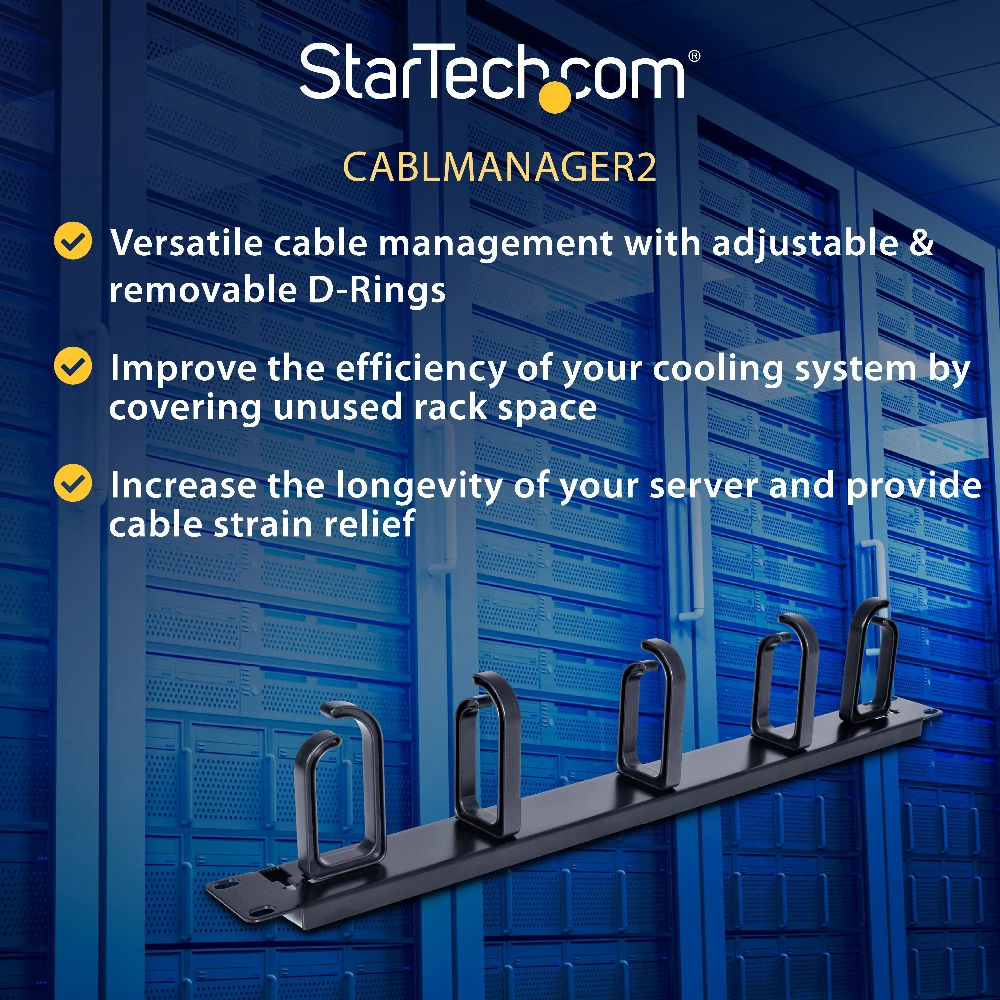 The CABLMANAGER2 1U Cable Management Panel mounts to a standard 19” 2 or 4-post rack to help you organize network, server or KVM cabling, using D-Ring hooks. This TAA compliant product adheres to the requirements of the US Federal Trade Agreements Act (TAA), allowing government GSA Schedule purchases.