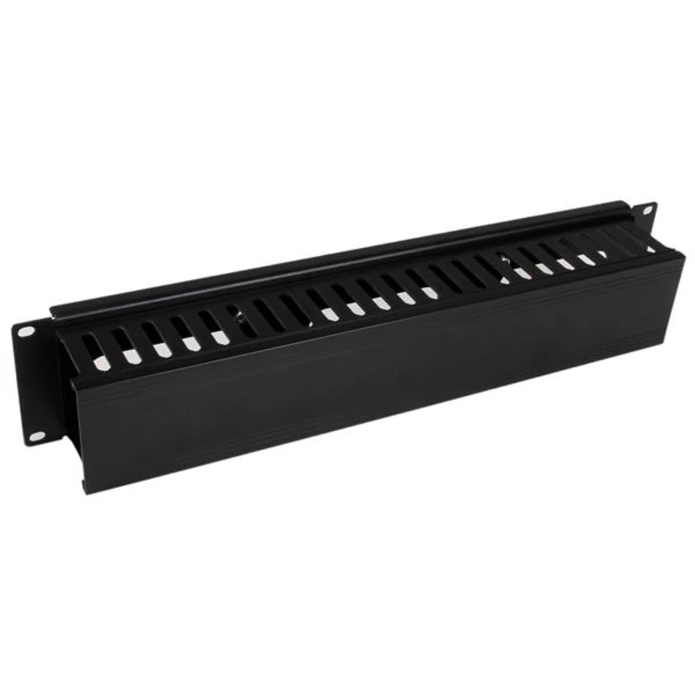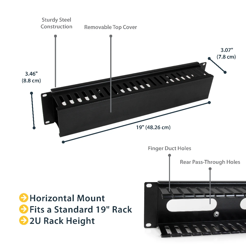 StarTech.com 2U Horizontal Finger Duct Rack Cable Management Panel with Cover, Cable management panel, Black, Plastic, Steel, 2U, EIA RS310-D, CE, TAA, REACH