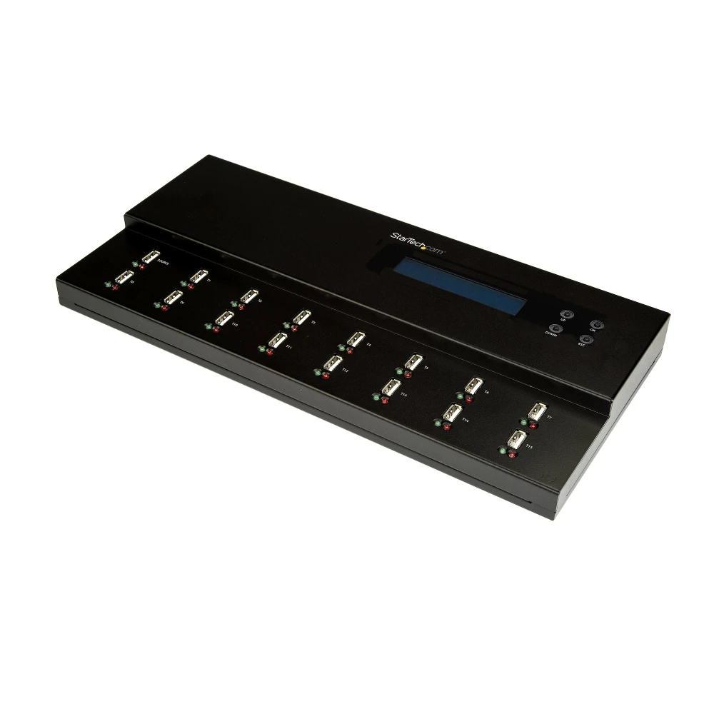 Standalone 1 to 15 USB Thumb Drive Duplicator & Eraser, Flash Drive CopierThis USB duplicator and eraser lets you clone or erase up to 15 USB flash drives, without a host computer connection. This means you can work more efficiently and manage larger batches of USB drives, saving time and effort.The standalone USB duplicator and eraser is perfect for IT professionals and system administrators in corporate, education, marketing, or sales environments.Efficient 1:15 drive duplicationThe duplicator lets you copy up to 15 drives simultaneously, and offers both synchronous and asynchronous duplication, with speeds up to 1.5GB per minute. The asynchronous feature means you can remove and replace USB storage devices while other copies continue to run. The duplicator offers two duplication modes, system and file and whole file.Erase multiple USB drives simultaneouslyThe drive duplicator/eraser lets you erase up to 15 flash drives at the same time, so it?s easy to clean large batches of USB drives for reuse. The flash drive duplicator features three modes of drive erasing: quick erase, single pass erase, and multi-pass erase (meets DoD standards).Designed for ease of useThe flash drive duplicator and eraser supports USB 3.0, USB 2.0 and USB 1.1 flash drives, providing an easy and cost-effective way to re-use and re-purpose your USB drives. It features a robust metal housing and a compact, standalone design that makes it the perfect desktop companion. The flash drive eraser/copier also has an LCD display that makes it easy to monitor erasing and duplication to ensure completion.The USBDUPE115 is TAA compliant and backed by a StarTech.com 2-year warranty and free lifetime technical support.The StarTech.com Advantage