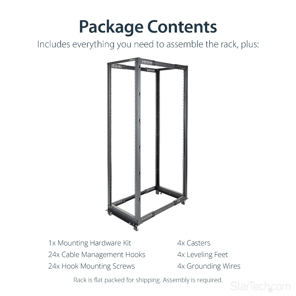 Computer Equipment Rack | 22" to 40" Adjustable Mounting Depth | Casters | Leveling Feet | Cable Management HooksThe 4POSTRACK42 42U Server Rack lets you store your servers, network and telecommunications equipment in a sturdy, adjustable depth open-frame rack.Designed with ease of use in mind, this 42U rack offers easy-to-read markings for both rack units (U) and depth, with a wide range of mounting depth adjustments (22 - 40in) that make it easy to adapt the rack to fit your equipment.This durable 4-post rack supports a static loading capacity of up to 1322lbs (600kg), and offers compliance with several industry rack standards (EIA/ECA-310, IEC 60297, DIN 40494) for a universal design that's compatible with most rack equipment.For a complete rack solution that saves you time and hassle, the rack includes optional accessories such as casters, leveling feet and cable management hooks. The base is also pre-drilled for securing the rack to the floor if needed, providing you with many options to customize the rack to fit your environment.Backed by a StarTech.com 2-year warranty and free lifetime technical support.The StarTech.com Advantage