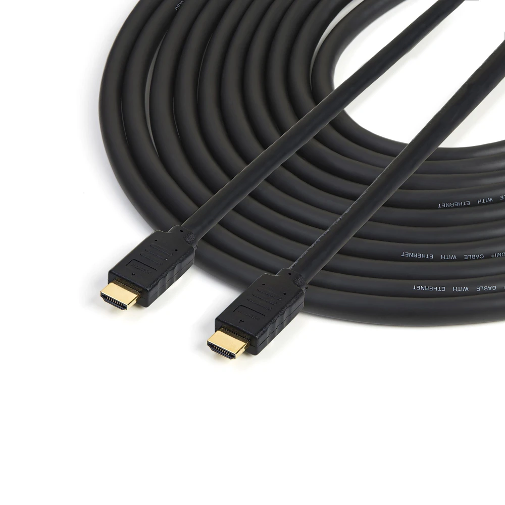 StarTech.com 50ft (15m) HDMI 2.0 Cable - 4K 60Hz Active HDMI Cable - CL2 Rated for In Wall Installation - Long Durable High Speed UHD HDMI Cable - HDR, 18Gbps - Male to Male Cord - Black (HD2MM15MA) StarTech.com 50ft (15m) HDMI 2.0 Cable - 4K 60Hz Active HDMI Cable - CL2 Rated for In Wall Installation - Long Durable High Speed UHD HDMI Cable - HDR, 18Gbps - Male to Male Cord - Black. Cable length: 15 m, Connector 1: HDMI Type A (Standard), Connector 1 gender: Male, Connector 2: HDMI Type A (Standard), Connector 2 gender: Male, Connector contacts plating: Gold, HDMI version: 2.0, 3D, Product colour: Black - 50ft (15m) Active HDMI 2.0 Cable w/18Gbps bandwidth; UHD 4K 60Hz (3840x2160)/HDR/21:9 aspect ratio/32ch audio channels w/1536Hz sampling - Active amplifier supports BT.2020 colorimetry/3D video/CEC/multistream audio to up to 4 users/dual video stream - High speed HDMI cable with durable PVC jacket and CL2 Fire Rating for in-wall installations|Ideal for monitors displays projectors in home/office/boardroom/classroom - Performs to full HDMI 2.0 specs and previous HDMI versions - StarTech.com 2-year warranty Create feature-rich HDMI connections, up to 15 m away with no signal lossThis CL2 HDMI cable is rated for in-wall installations. It also has a built-in active signal booster that allows for a connection distance of up to 50 feet (15 m) between your HDMI devices, with no signal loss. The cable is also backward compatible with previous HDMI specifications and will work with all of your existing HDMI devices.Create 4K HDMI connections over longer distancesThe cable?s built-in amplifier circuitry actively boosts the HDMI signal with no external power required. It supports longer connections than regular HDMI. The active cable also features a thinner wire construction for more flexibility, making it ideal for in-wall installations.Experience the best that HDMI has to offerThis 4K HDMI cable supports resolutions of up to 4K@60Hz (3840x2160p) and bandwidths of up to 18Gbps. It also supports HDR (High Dynamic Range) for higher contrast ratio and vivid colors.With higher resolutions, increased speeds, and sharper images, the cable provides the very best HDMI capabilities available today. It?s the perfect cable for creating the ultimate home-theater experience, for providing lifelike digital signage, or for delivering exceptional presentations.The cable also supports up to 32 uncompressed digital audio channels to provide crystal-clear sound.The HD2MM15MA is backed by a StarTech.com 2-year Warranty.Note : This cable features unidirectional architecture which requires that the cable is installed in the correct direction. Please ensure that the HDMI connector labeled with "TV" is connected to the display, in order to ensure that the device and the HDMI source are connected properly.The StarTech.com Advantage