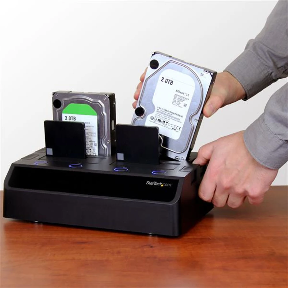 Access multiple drives with this quad-bay docking station. It saves you valuable time every day by giving you independent access to four 2.5? or 3.5? SATA hard drives or solid-state drives. Ideal for data recoveries, imaging or backups, it lets you access four drives at once, instead of connecting your drives one by one.