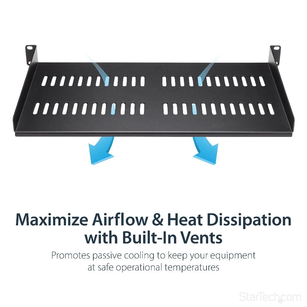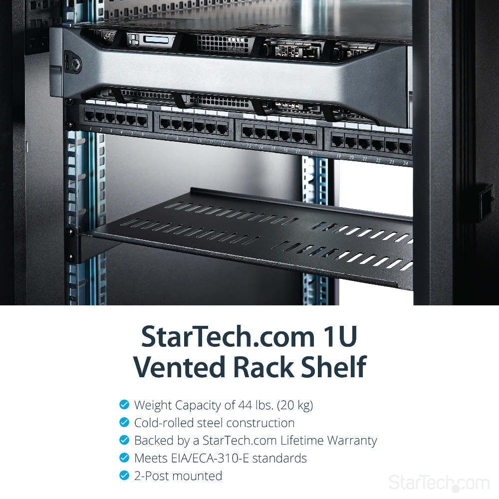 StarTech.com 1U Server Rack Shelf - Universal Vented Rack Mount Cantilever Tray for 19" Network Equipment Rack & Cabinet - Heavy Duty Steel - Weight Capacity 50lb/23kg - 10" Deep, Black (CABSHELFV1U) StarTech.com 1U Server Rack Shelf - Universal Vented Rack Mount Cantilever Tray for 19" Network Equipment Rack & Cabinet - Heavy Duty Steel ? Weight Capacity 50lb/23kg - 10" Deep Shelf, Black. Type: Rack shelf, Product colour: Black, Housing material: Steel. Width: 482.6 mm, Depth: 254 mm, Height: 44.5 mm. Quantity per pack: 1 pc(s), Package width: 275 mm, Package depth: 530 mm. Master (outer) case width: 327 mm, Master (outer) case length: 530 mm, Master (outer) case height: 298 mm - 19" compliant 1U 10" deep server rack cabinet shelf for a universal fit in any EIA/ECA-310 server/AV rack and includes mounting hardware - Vented rackmount cantilever tray improves airflow around devices on shelf and within the rack - Heavy-duty and easy to install constructed of durable 16 AWG SPCC commercial cold-rolled steel for up to 44lbs - For flexibility the shelf mounts in multiple orientations w/ridge on one side to prevent equipment sliding off w/24 hour support Add a sturdy, 1U server rack shelf into almost any rack or cabinetThis 1U rack shelf lets you add 10 in. of flat storage space to any EIA-310 compliant server rack or cabinet. The shelf is vented to improve air flow and help lower temperatures in your rack.Ensure your equipment is secureThe durable fixed-rack shelf can hold up to 20 kg (44 lbs.) of equipment and is constructed using SPCC commercial-grade cold-rolled steel.Make the most of your available spaceThe 1U cantilever shelf lets you optimize your working space by giving you the ability to mount equipment to your rack instead of taking up desk or floor space. It?s perfect for your SOHO (small office, home office) environment, server room or any other location with limited space available.Customize your setupYou can install the 1U vented rack shelf in your rack at any height, giving you a stable surface for placing equipment that's un-mountable or storing your tools.The CABSHELFV1U is backed by a StarTech.com lifetime warranty and free lifetime technical support.The StarTech.com Advantage