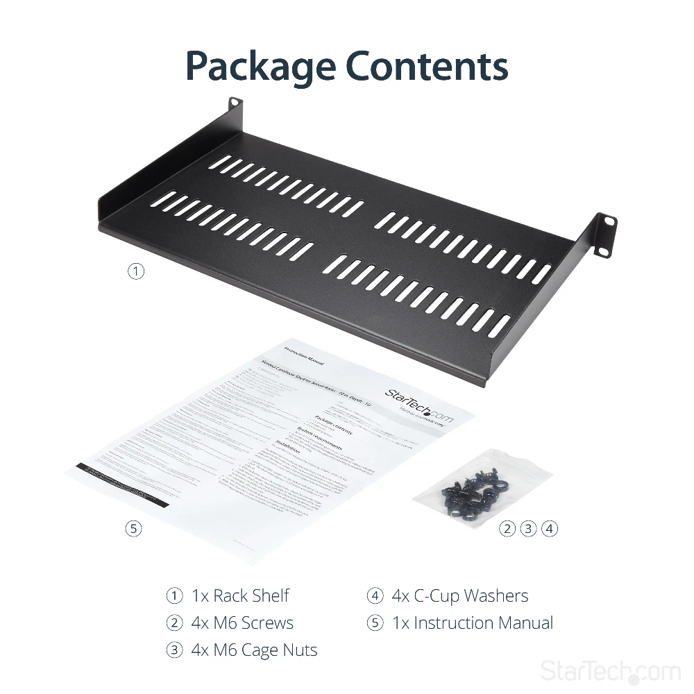 StarTech.com 1U Server Rack Shelf - Universal Vented Rack Mount Cantilever Tray for 19" Network Equipment Rack & Cabinet - Heavy Duty Steel Weight Capacity 50lb/23kg - 10" Deep Shelf, Black, Rack shelf, Black, Steel, 20 kg, 1U, 482.6 mm