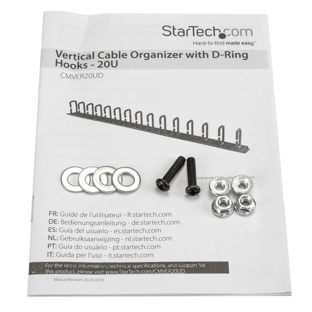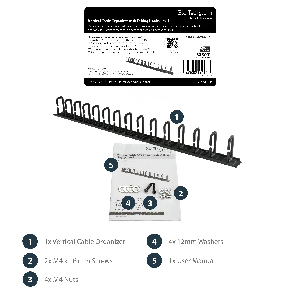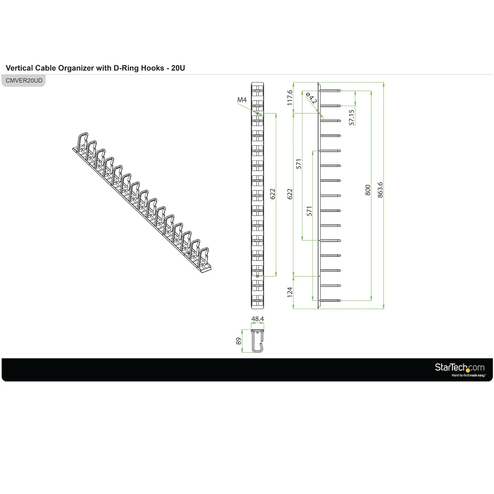 StarTech.com Vertical Cable Organizer with D-Ring Hooks - 0U - 2.8ft.. Type: Cable management panel, Product colour: Black, Housing material: Steel. Width: 863.6 mm, Depth: 50 mm, Height: 87 mm. Quantity per pack: 1 pc(s), Package width: 145 mm, Package depth: 960 mm. Master (outer) case width: 145 mm, Master (outer) case length: 960 mm, Master (outer) case height: 105 mm
