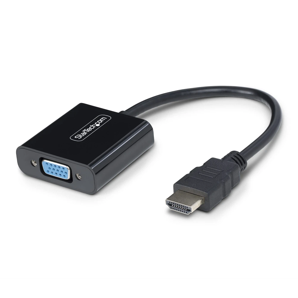 StarTech.com HDMI to VGA Adapter, Active Video Converter For Laptop/Desktop, 1920x1080 (1080p), HDMI Source to VGA Monitor StarTech.com HDMI to VGA Adapter, Active Video Converter For Laptop/Desktop, 1920x1080 (1080p), HDMI Source to VGA Monitor/Display/Projector. Converter type: Active video converter, Housing material: Plastic, Cable length: 0.189 m. Maximum video resolution: 1920 x 1200 pixels, Video resolutions: 800 x 600,1024 x 768,1280 x 720,1280 x 800,1600 x 1200,1680 x 1050,1920 x 1080,1920 x 1200, Supported video modes: 1080p. Host interface: HDMI, Output interface: VGA. Width: 45 mm, Depth: 234 mm, Height: 15 mm. Package width: 50 mm, Package depth: 50 mm, Package height: 18 mm - HDMI to VGA Adapter converts from an HDMI video source to a VGA output for connecting legacy monitors/displays; Supports up to 1920x1200/1920x1080 (1080p) - Universal Video Converter is compatible with any OS - Works with HDMI laptops/desktops/Chromebooks from all hardware platforms (Intel/ Nvidia/AMD) - No power adapter or USB power connection required reduces clutter and simplifies the setup - Connect a VGA monitor or projector or add a secondary extended/mirrored display to a workstation Connect an HDMI-enabled laptop or desktop to a VGA display or projector